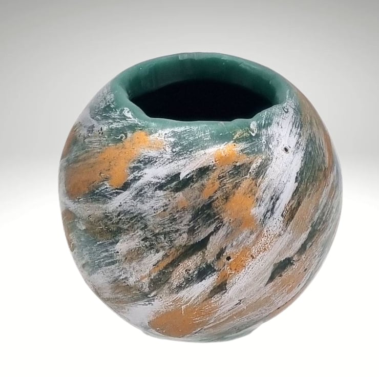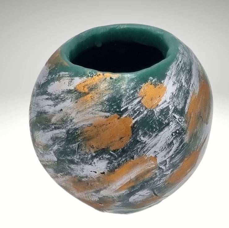 A spherical trinket bowl made from green wax decorated with gold and silver. Great for adding some glitz to your home decor. Ideal dressing table container for holding make up or as a container for bits and bobs in a craft room or home office. It could also be used as a vase for short stemmed flowers.