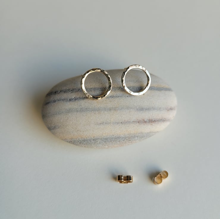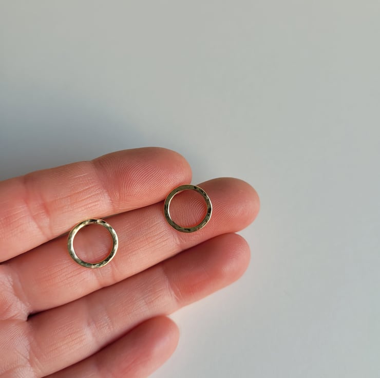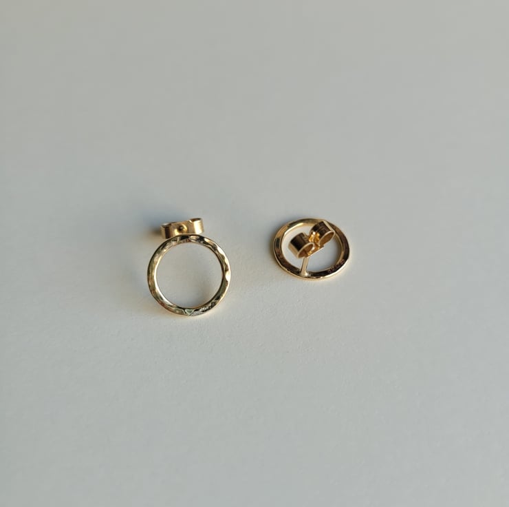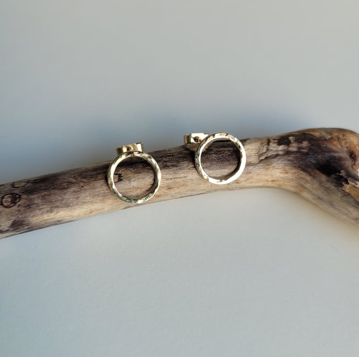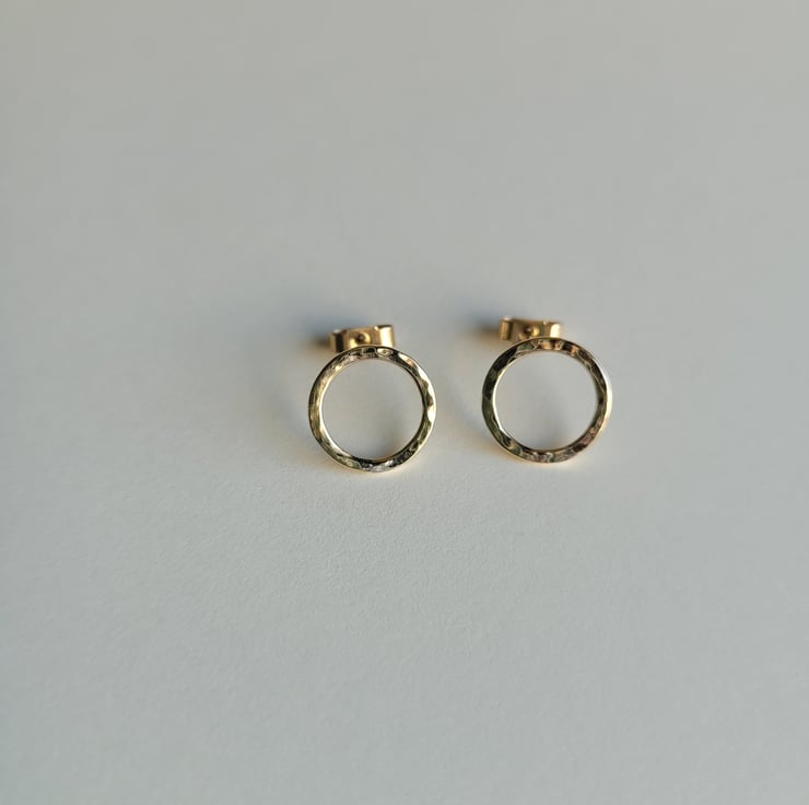 These ring stud earrings have been handmade in recycled 9ct yellow gold. Round profile 9ct gold wire has been cut to two lengths and formed into ring shapes, flattened a little and given a hammered texture. The hammered texture creates a shimmery dimpled effect. 9ct yellow gold earring pin posts have been soldered onto the back of the hammered circles.
