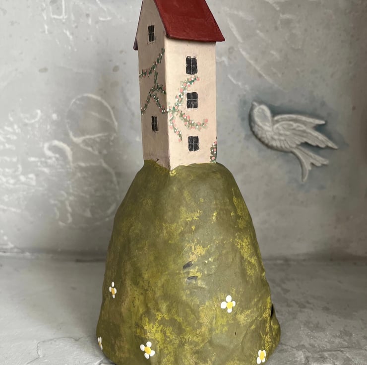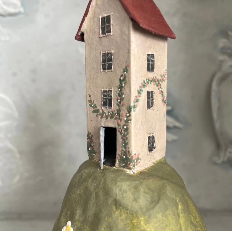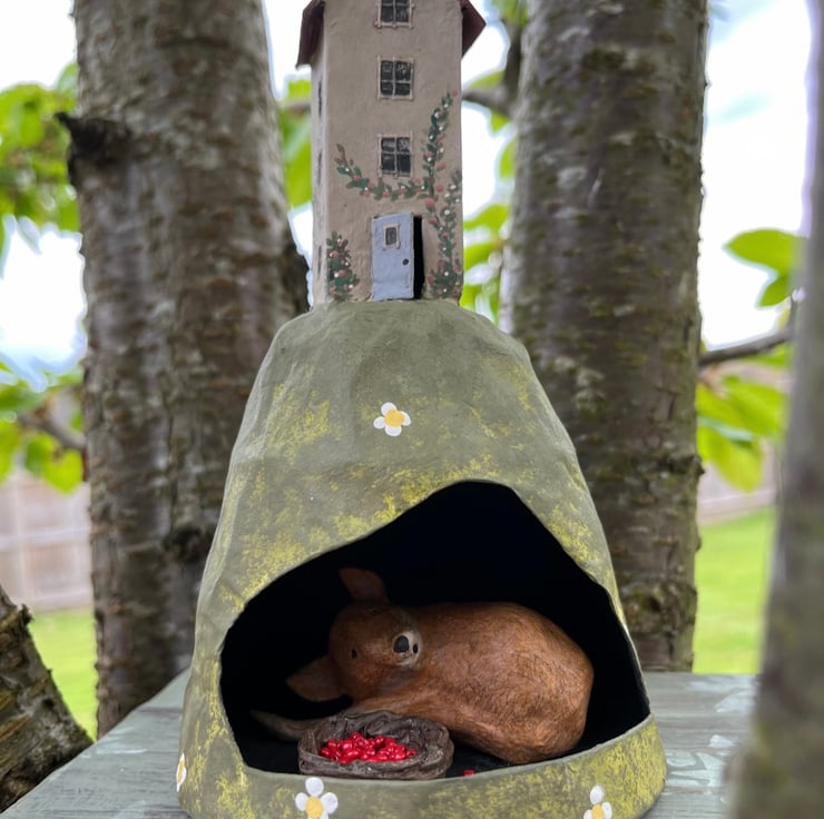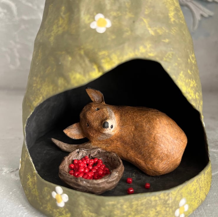 A paper mache fox in his den with a handmade basket of seed bead berries. On top of the hill is a paper house with open door. The shape of this assemblage art piece is achieved using a salvaged glass lampshade, and also incorporated are recycled paper and cardboard, florist wire, tin foil, masking tape, and many layers of gluey paper. The piece is finished with chalk paint and wax.