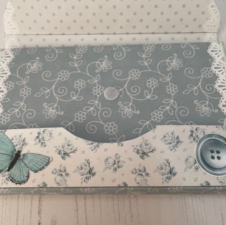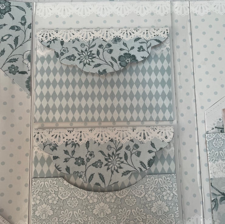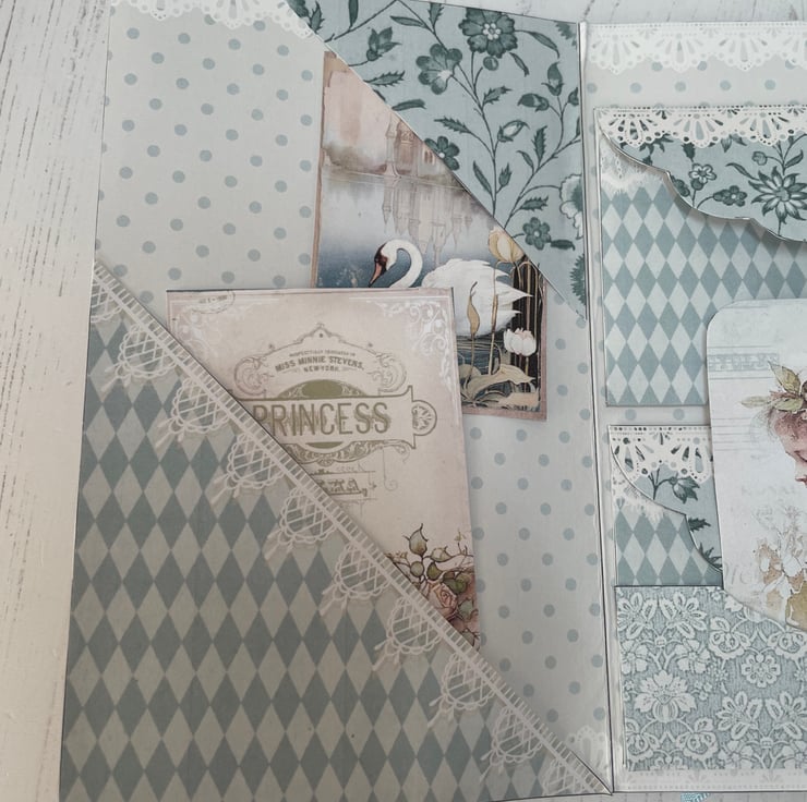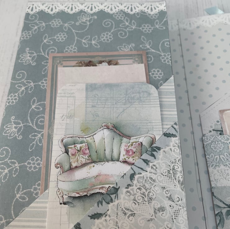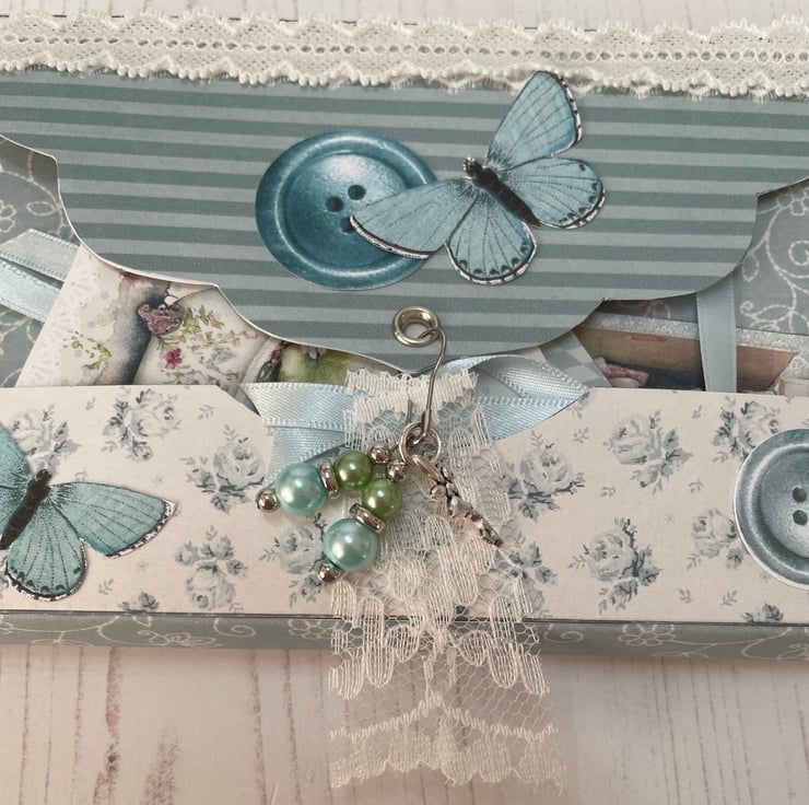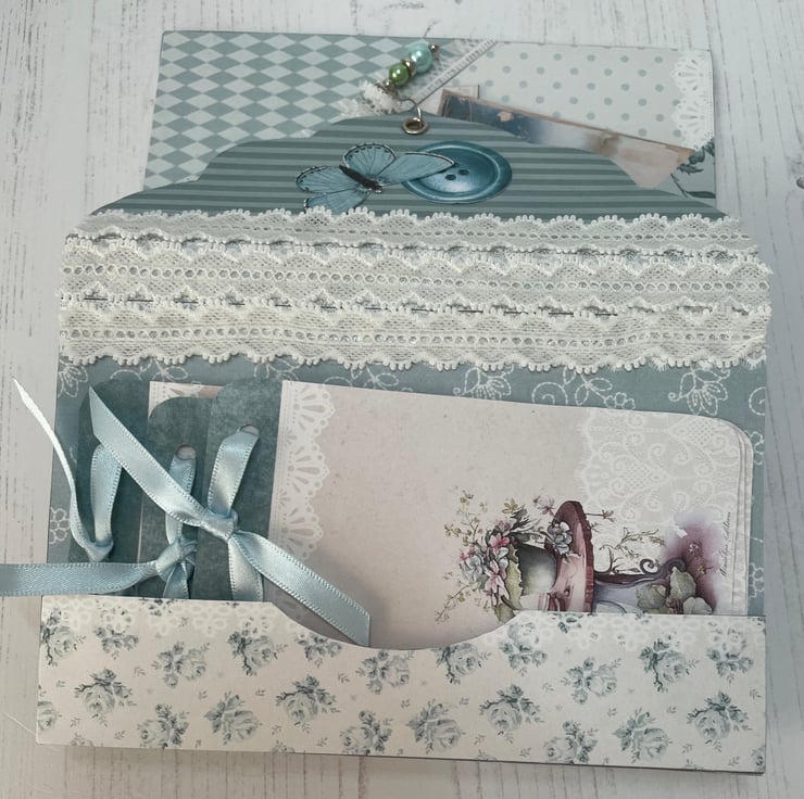 Shades of blue with hint of ivory pretty papers made into a folio. 12 pockets/ tuck spots. 14 tags/journalling cards. Pale blue ribbon to the tags. A perfect gift for a fairy lover. Measures 6.5” x 4.25” x 0.75”. Lace to the front of the folio, bead and fairy dangle. Silver elastic cord with pastel stars at the ends.