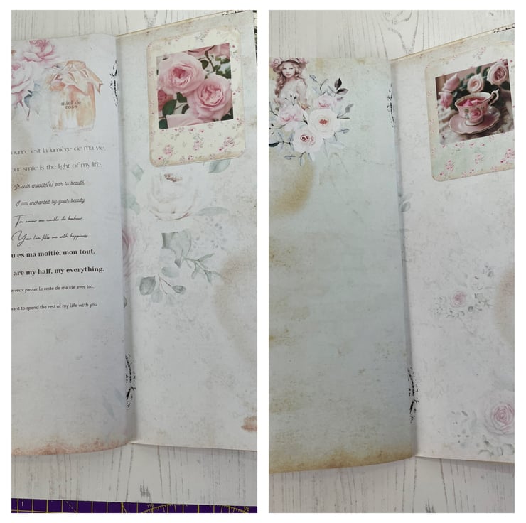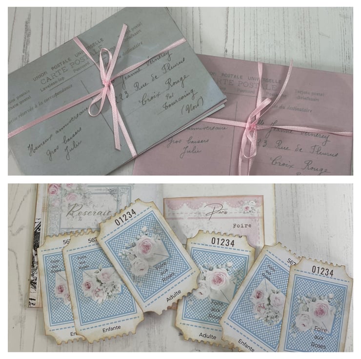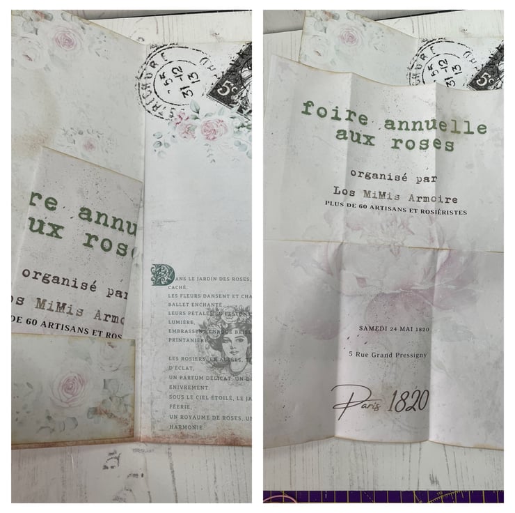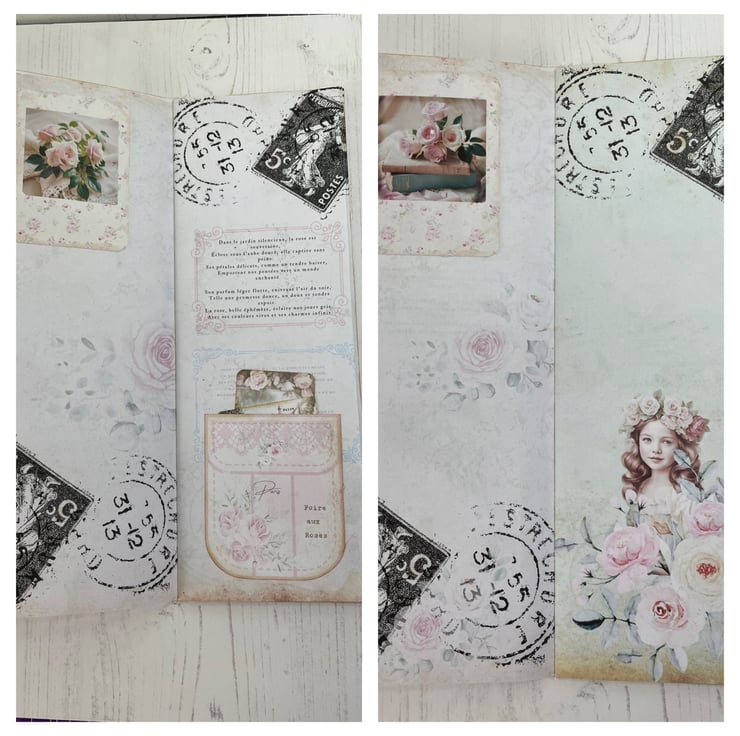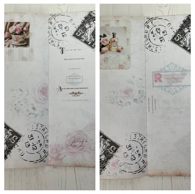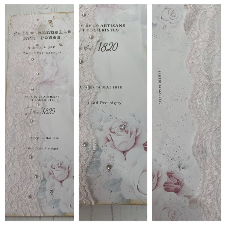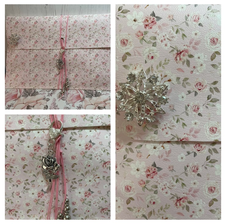 Faux leather in a rose print made into a clutch folio. Flap secured with cord, silver tone beads, removable rose charm on a heart lobster clasp. Pretty removable diamanté brooch. Contents include 6 envelopes and letters in French. Tied with pink ribbon and bead dangles. Tall skinny journal celebrating the Annual Rose Fair. Delicate pink pages do pretty. Lace trim to the sides of the journal covers, the front has added diamantés for detail. Inside holds 24 pages with printed images. In addition 4 pockets and 11 photos. Measures pouch 11.75” x 7.75”. Journal 11” x 4”.