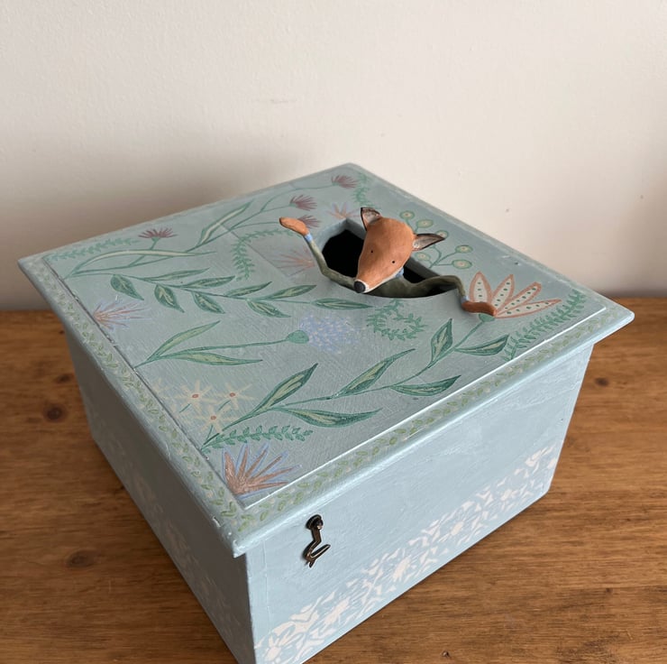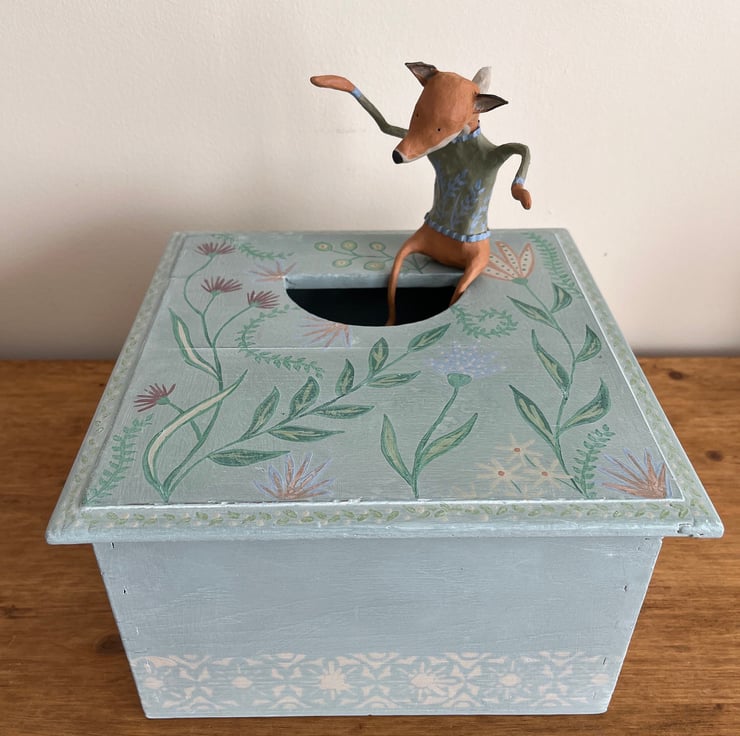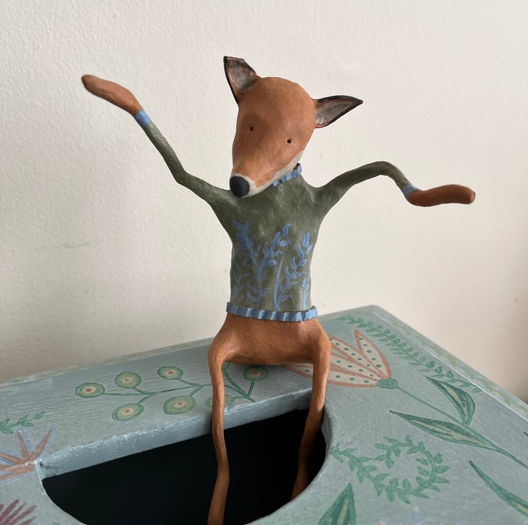 An unusual find - this box, for some reason, has had a half-circle cut into its lid, but it just seemed perfect for a little paper mache critter to be involved; made out of tin foil, masking tape, florist wire, and layers of gluey paper, this red fox is finished with chalk paint and wax, and sits nicely to the side of the box or in the hole.