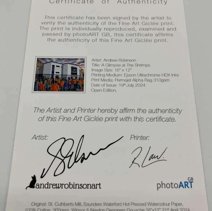 Titled ‘ A Glimpse At The Shrimps’ this is a unique Morecambe print direct from myself the artist. My artworks are a celebration of the match day experience and of stadium architecture.