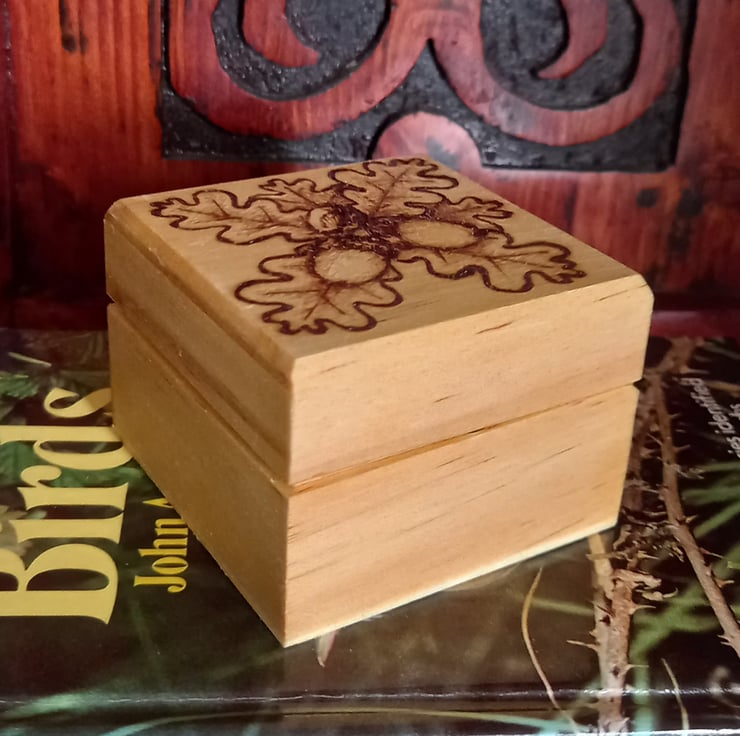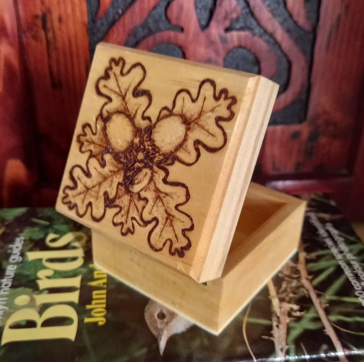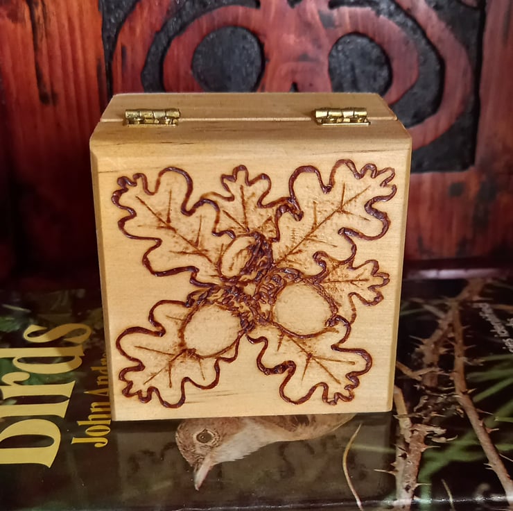 Small wooden box illustrated with oak leaves and acorns using pyrography (wood burning).