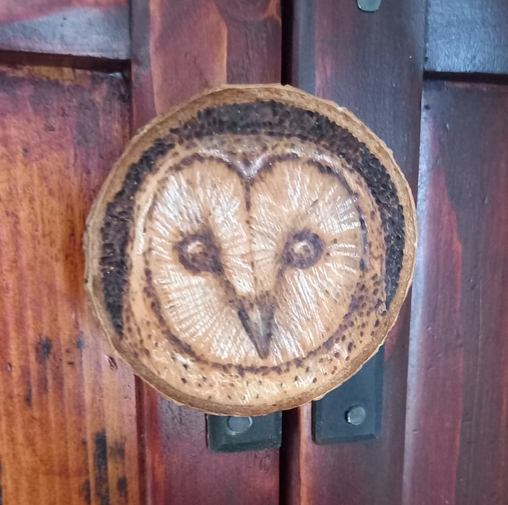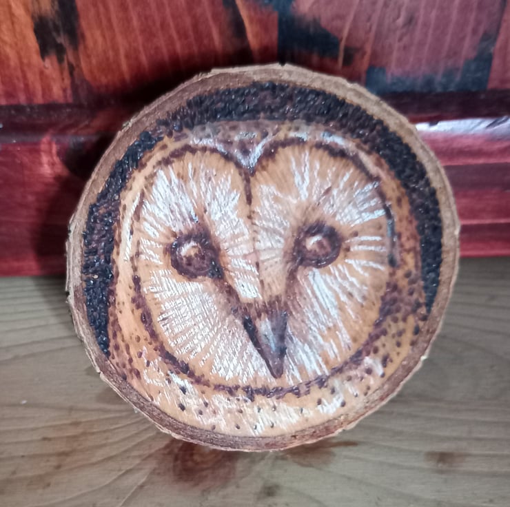 Barn owl wood slice magnet designed using pyrography (wood burning) and coloured using watercolour pencils.