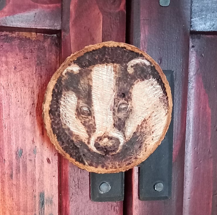Badger wood slice magnet designed using pyrography (wood burning) and coloured using watercolour pencils.