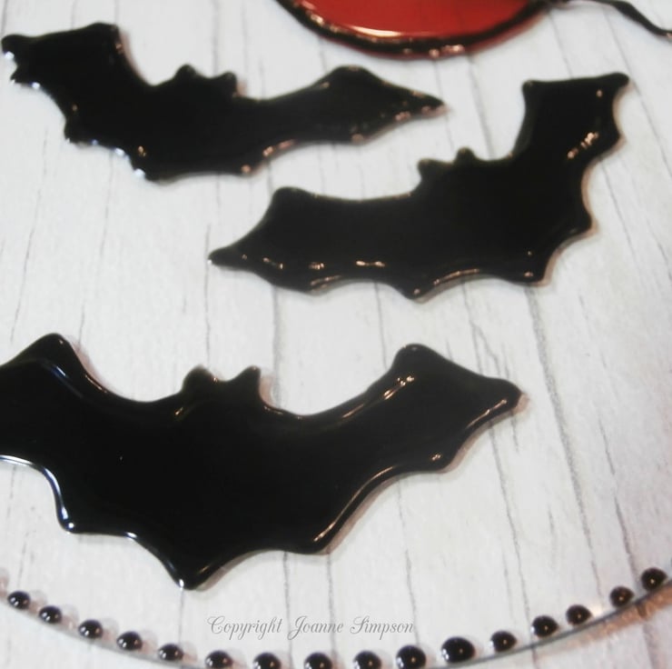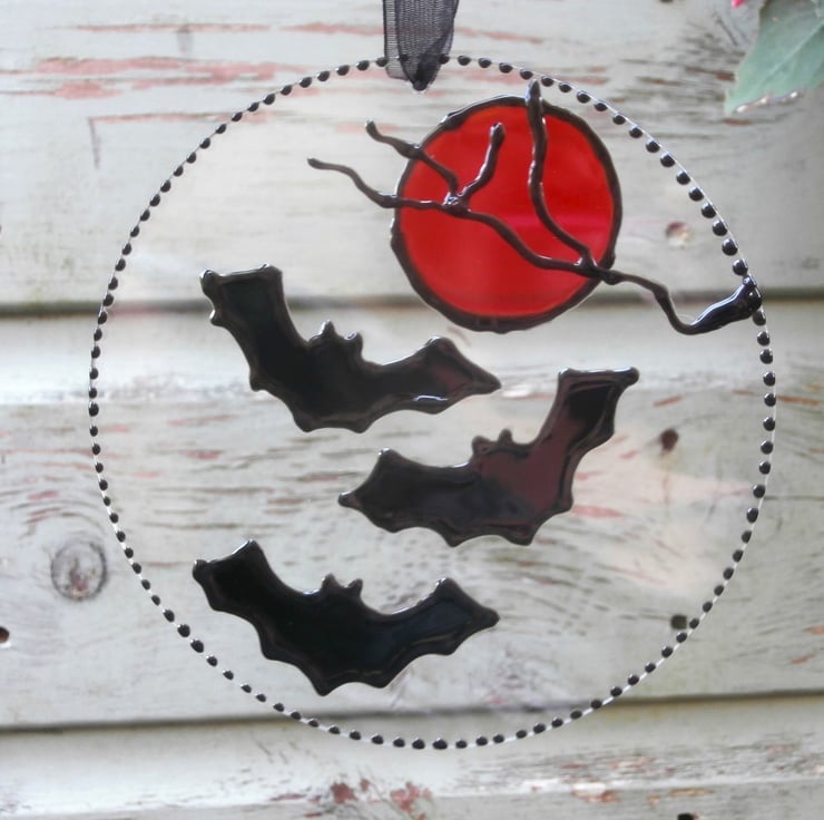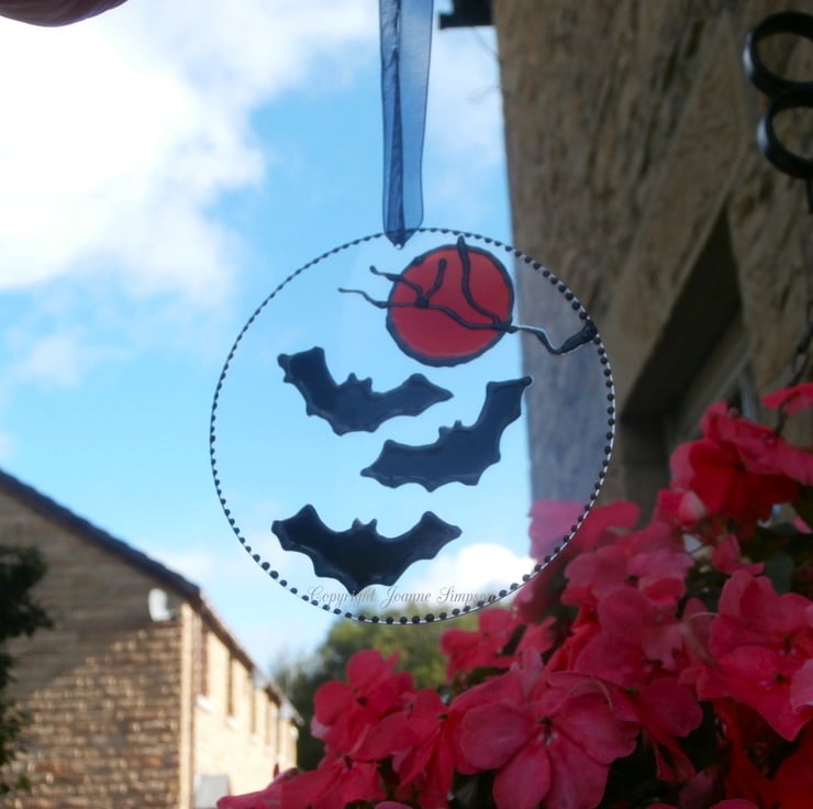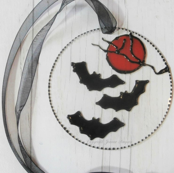 Be the envy of your friends this Halloween with a hand painted sun catcher featuring my Spooky bats design. Finished with a black organza ribbon.