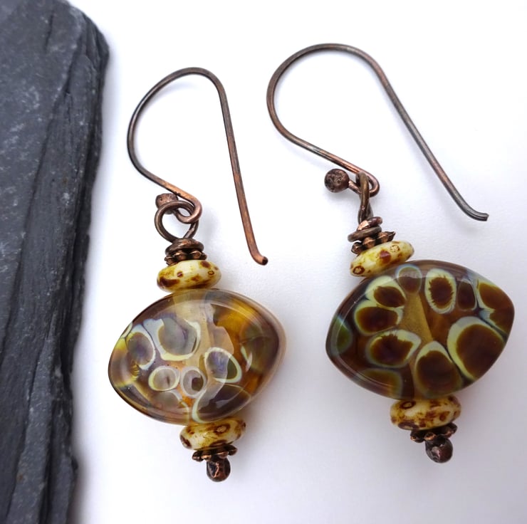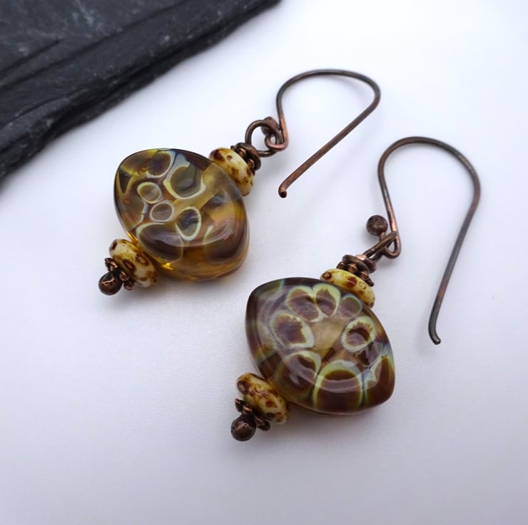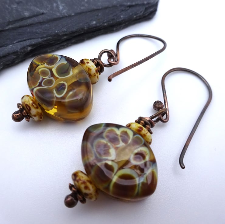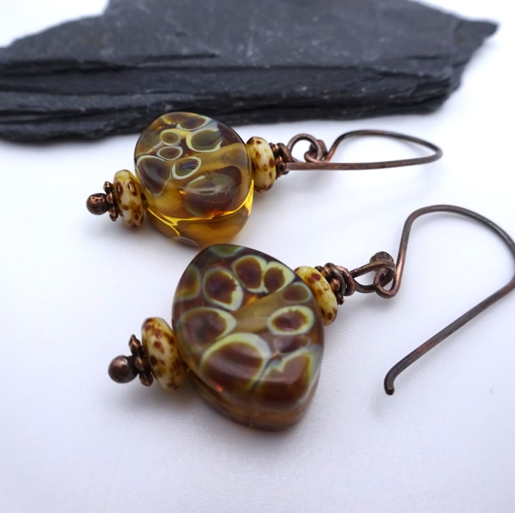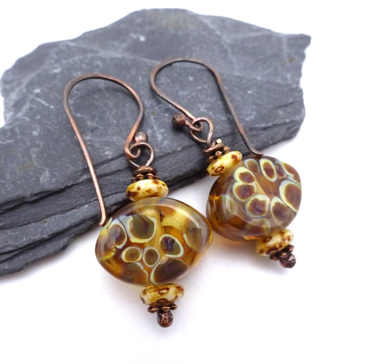 A pair of earrings made with handmade copper ear wires and handmade lampwork amber glass beads.
