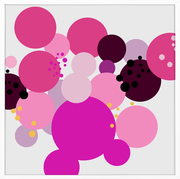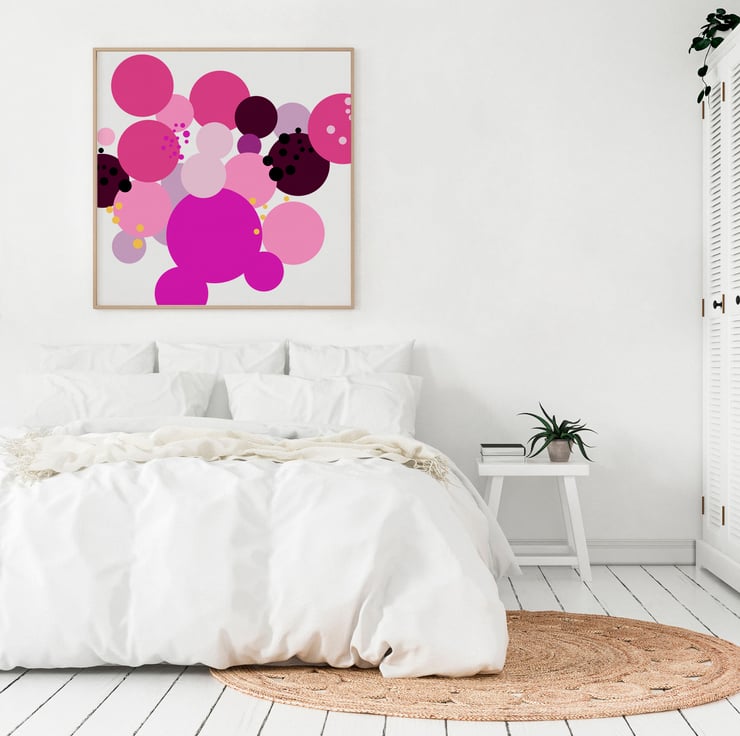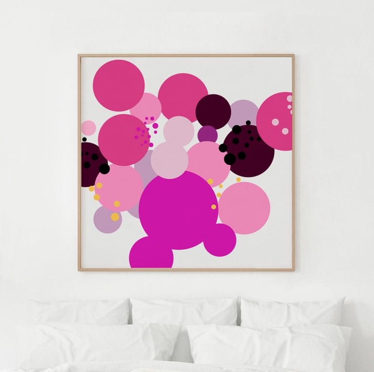 Elevate your space with the timeless beauty of this art print featuring a Geometric Abstract Bouquet of roses in shades of rose, red, dark red, pink, and lilac. Each circle represents a flower, with the diversity of sizes and colours capturing the beauty and vibrancy of a blooming. The arrangement might convey a sense of balance and visual interest, creating a delightful and aesthetically pleasing image.