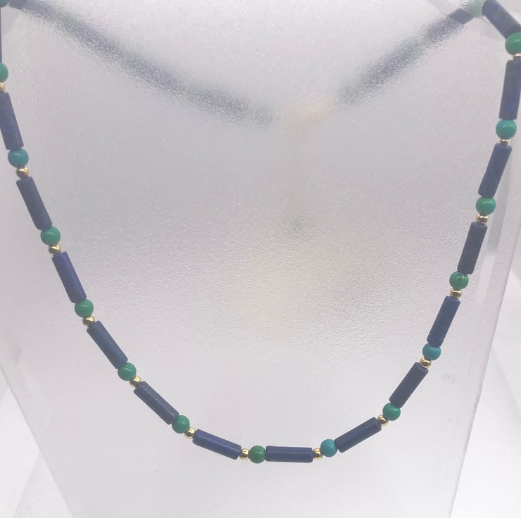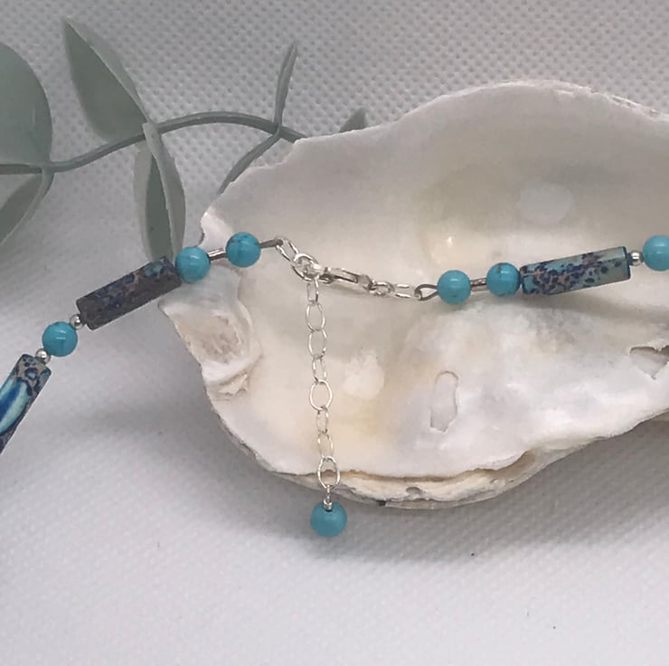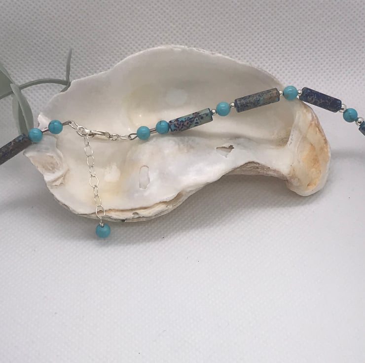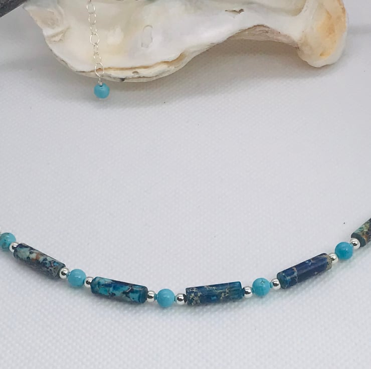 I made this necklace using tubular Terra Jasper beads in a lovely blue mix shade, and combined them with 4mm turquoise and sterling silver round beads.