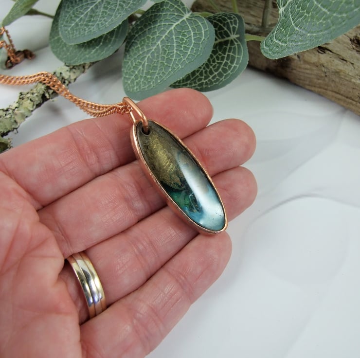 I began by making the resin art cabachon. Multiple layers of resin with inks and metal leaf to create a unique cabachon. I designed and made the copper bezel fitting to fit the cabachon perfectly using copper sheet. Fitted to an 18 inch pure copper chain.