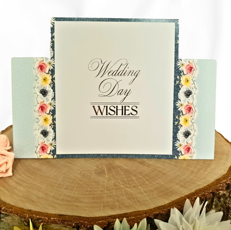 Made with quality printed cardstock cut to shape a stepper card, with floral borders on the two side steps (left & right) & the main topper in the middle & biggest step.