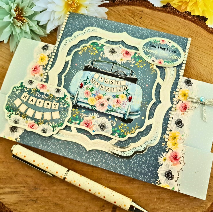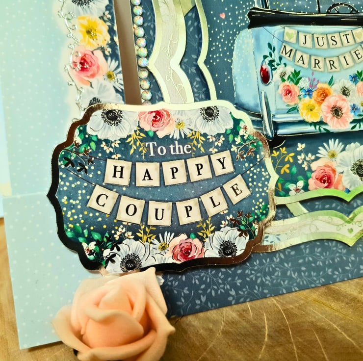 The main topper is surrounded with silver foiled frames & displays the classic image of an open car with the banner "Just Married" on the back.