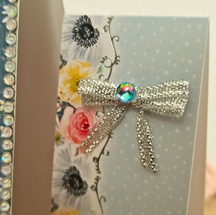 A handmade, keepsake stepper card in soft blue-grey colours, perfect for weddings.
