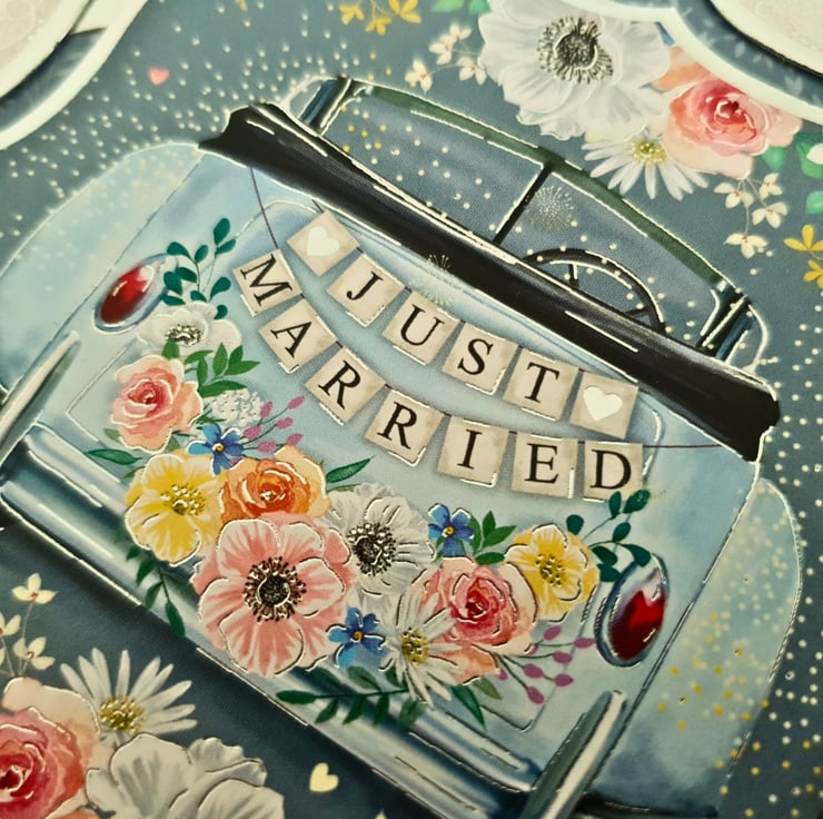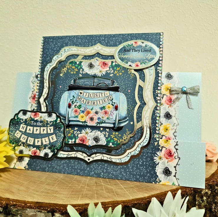 The main topper is surrounded with silver foiled frames & displays the classic image of an open car with the banner "Just Married" on the back.