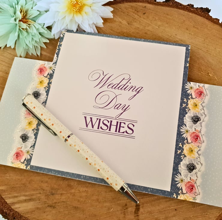 Two silver, smaller toppers decorate two opposite corners, displaying a banner with the wording "To The Happy Couple" & the sentiment "And They Lived Happily Ever After". It is finished with matching gemstones either side of the main step & a silver bow on the right step. At the back, the insert panel has the wording "Wedding Day Wishes" written in silver foil, while still provides you with space to add your handwritten wedding wishes.