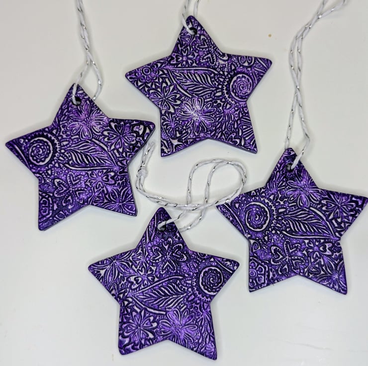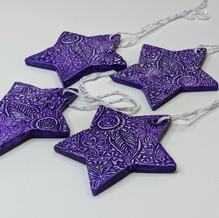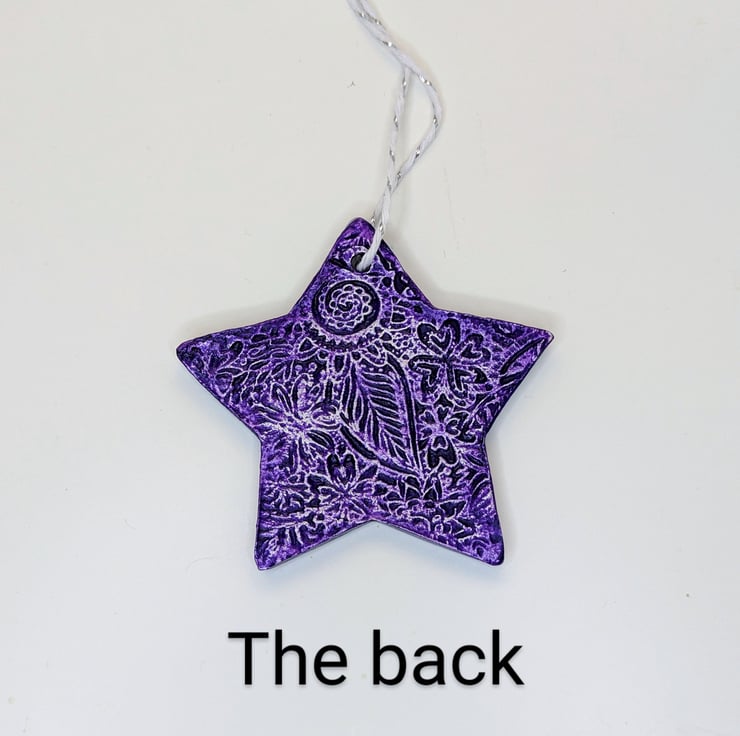 Pretty purple star Christmas tree decoration which has been lovingly created from air dry clay and embossed on both sides with a floral pattern. This decorative hanging star has been coloured with vibrant purple acrylic paint and varnished for durability. Supplied ready to hang from white and silver twine this decoration would look lovely hung on a Christmas tree, displayed in a window, hung from a handle, piece of furniture or from a jar.