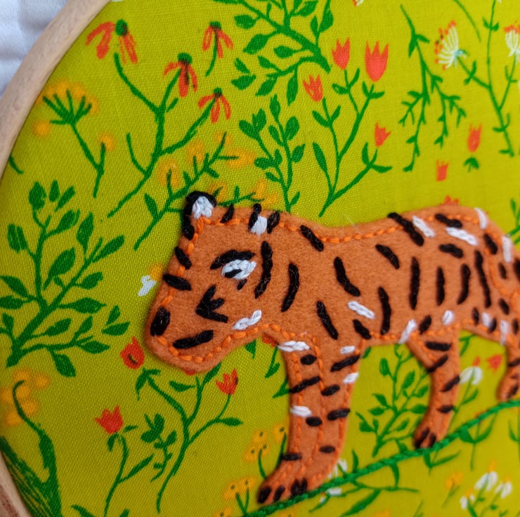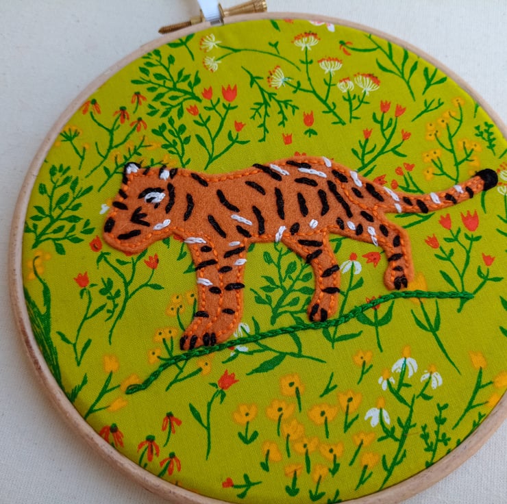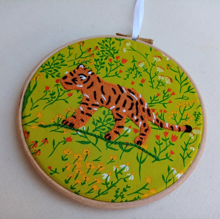 A stunning hoop art picture featuring my hand embroidered felt tiger walking among meadow flowers. A lovely gift for tiger lovers of all ages, the soft lines and playful features of the young cub means it is also perfect for decorating a nursery, child's bedroom or playroom.