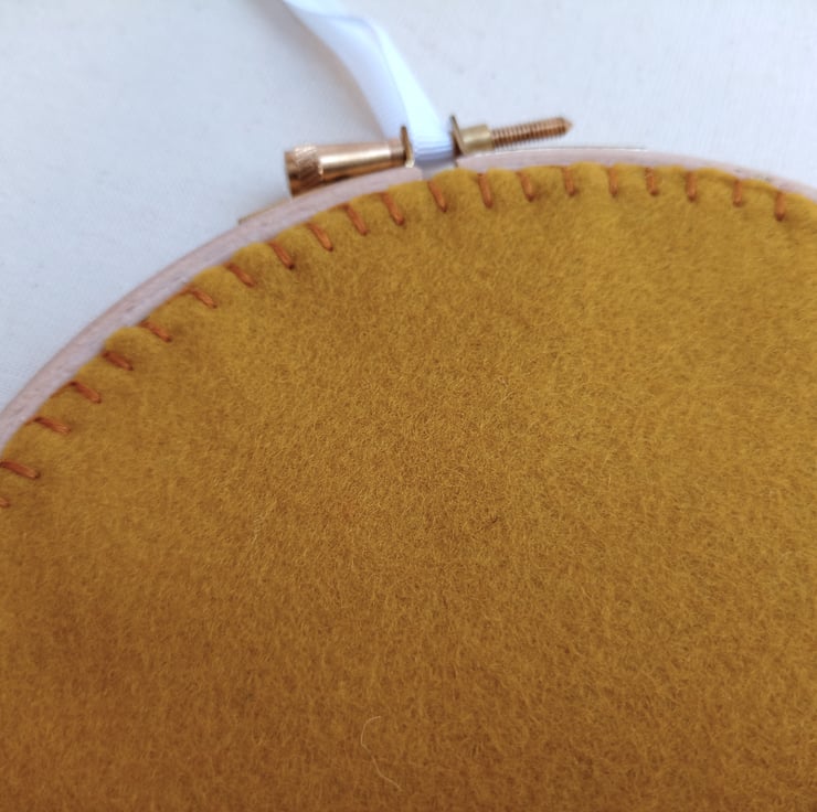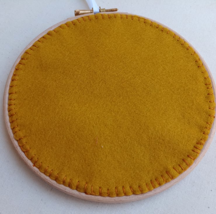 The picture was then mounted in a wooden hoop, and finished with a circle of dark orange wool felt, carefully hand stiched using blanket stitch - so the back is as neat as the front.