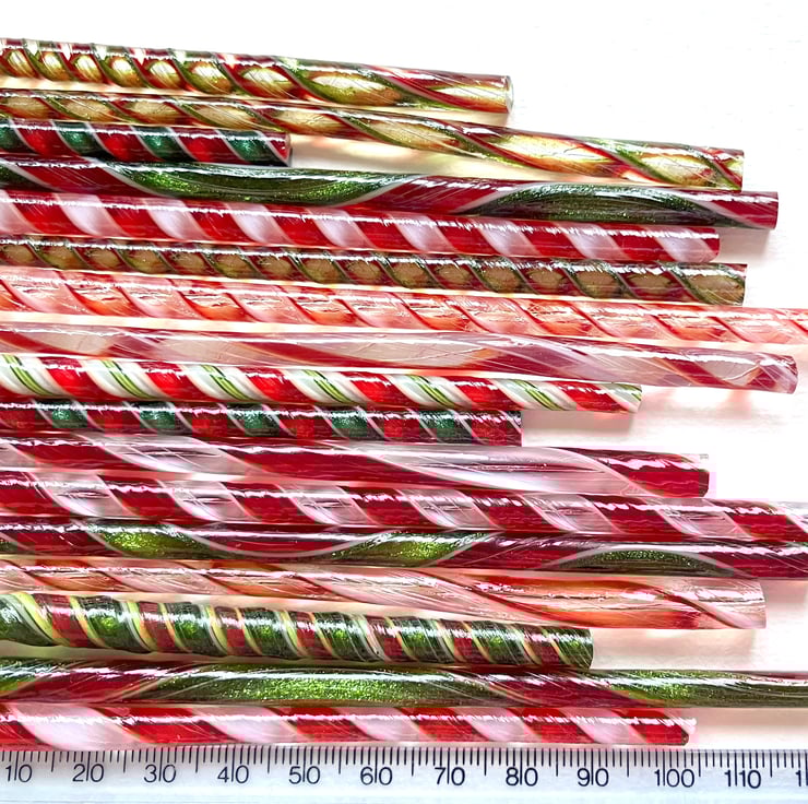 Bullseye 90 coe glass handmade Christmas mix twisty cane offcuts so uneven widths (approx 4-6mm) and lengths (approx 6-14cms).