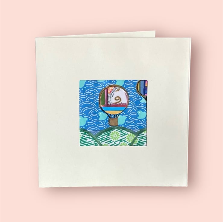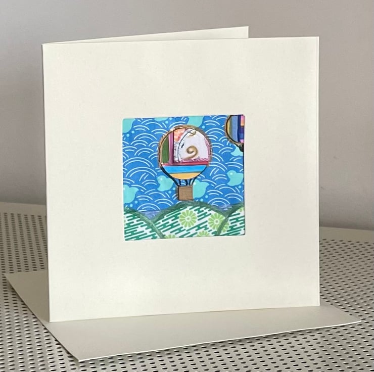 The card motif is a hand pieced collage depicting hot air balloons over the rolling Somerset hills.