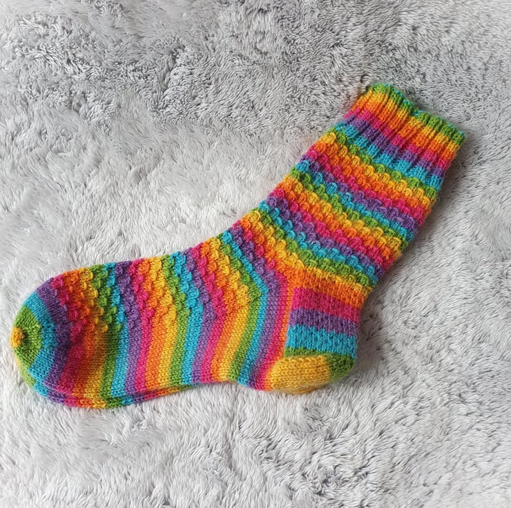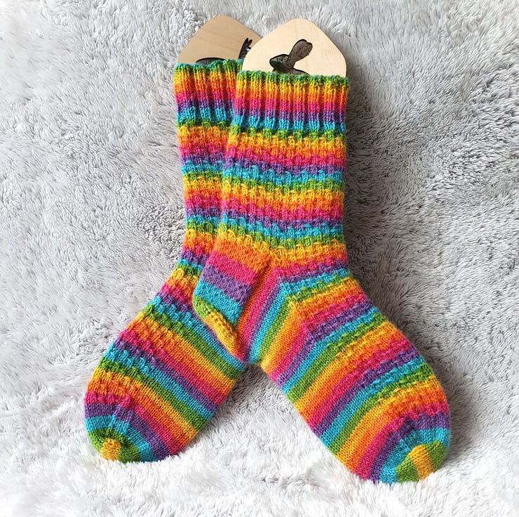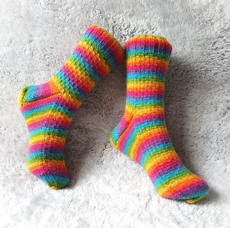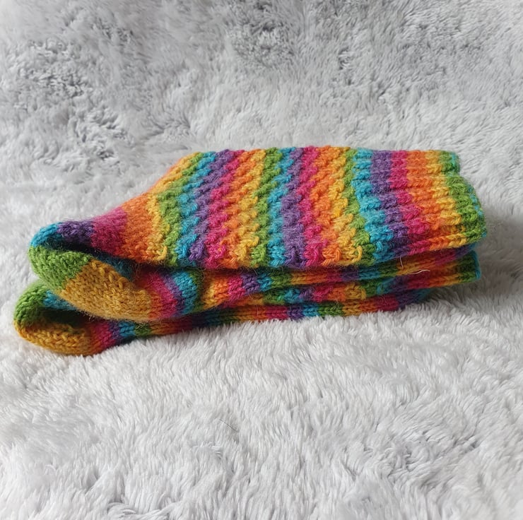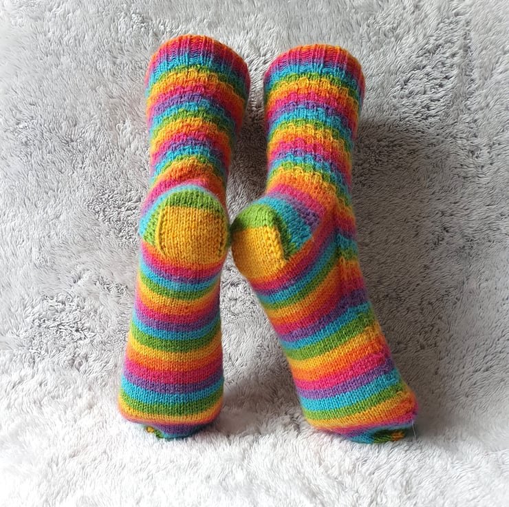 A pair of hand-knitted, multi-coloured socks with a distinctive stitch pattern. The lovely rainbow-coloured yarn is bright and cheerful, and compliments the subtle stitch pattern. These socks are cosy and friendly and would make a thoughtful gift. They are made completely by hand on double-pointed knitting needles, with a natural wool blend, which is cool to wear in warmer weather, and warm when it gets colder. Wool is soft, elastic, breathable and odour-resistant. It naturally wicks moisture away from your skin.