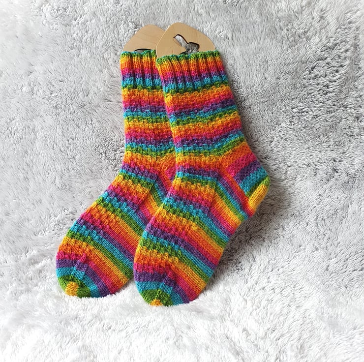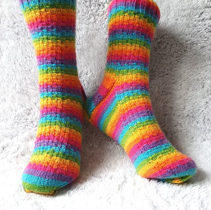 A pair of hand-knitted, multi-coloured socks with a distinctive stitch pattern. The lovely rainbow-coloured yarn is bright and cheerful, and compliments the subtle stitch pattern. These socks are cosy and friendly and would make a thoughtful gift. They are made completely by hand on double-pointed knitting needles, with a natural wool blend, which is cool to wear in warmer weather, and warm when it gets colder. Wool is soft, elastic, breathable and odour-resistant. It naturally wicks moisture away from your skin.