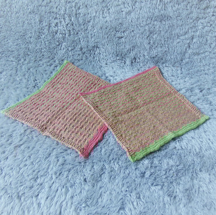 The cloths measure approximately 26 cm (9.5 inches) square. They are made with 4-ply cotton yarn in pastel pink and green.