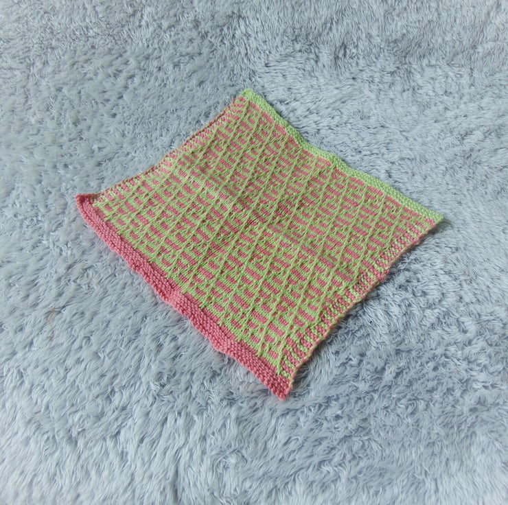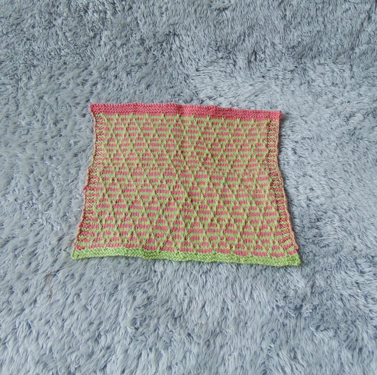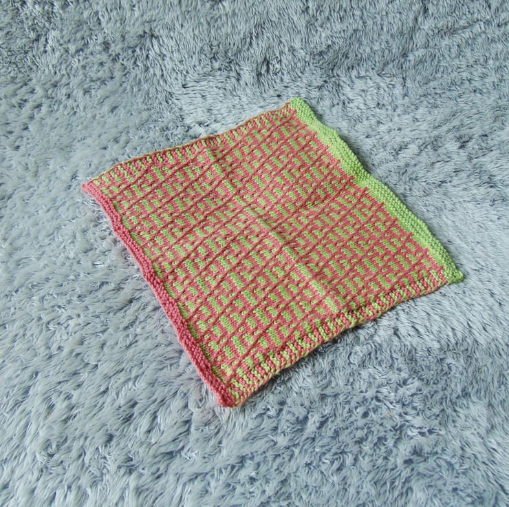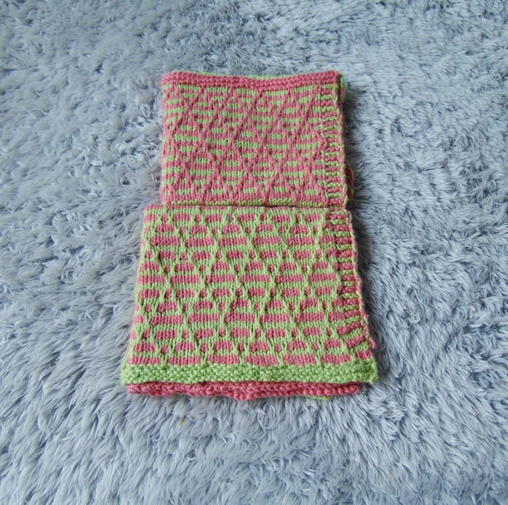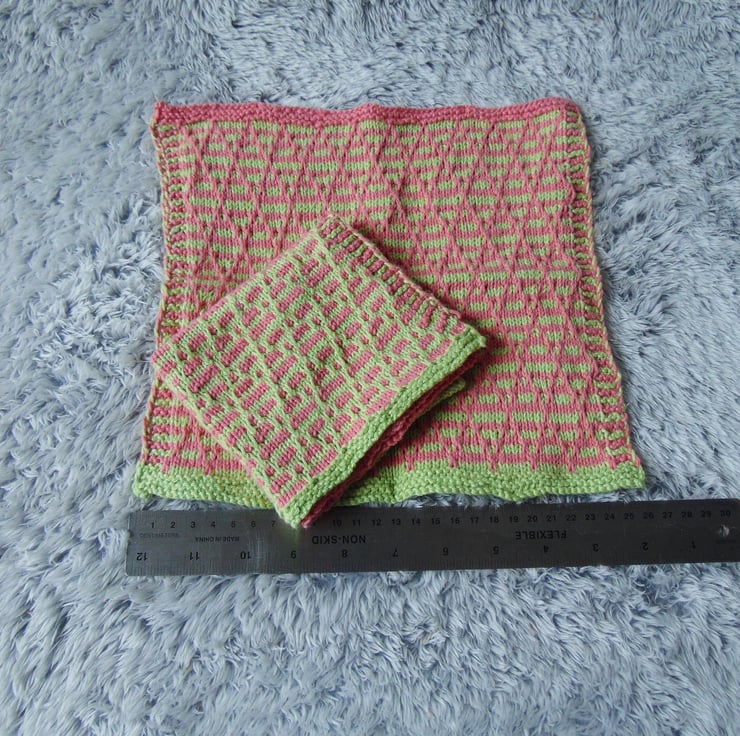 The cloths measure approximately 26 cm (9.5 inches) square. They are made with 4-ply cotton yarn in pastel pink and green.