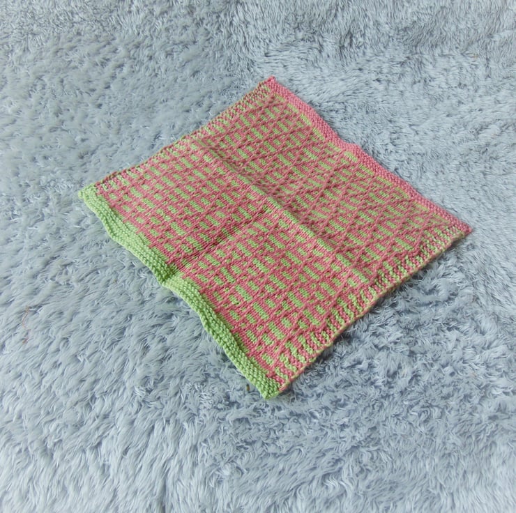 This set contains 2 green and pink dishcloths or washcloths, made from 100% cotton. They can be washed and reused over and over again and in fact, will generally soften a little with use. The squares can be used either as face cloths or as dishcloths in the kitchen.
