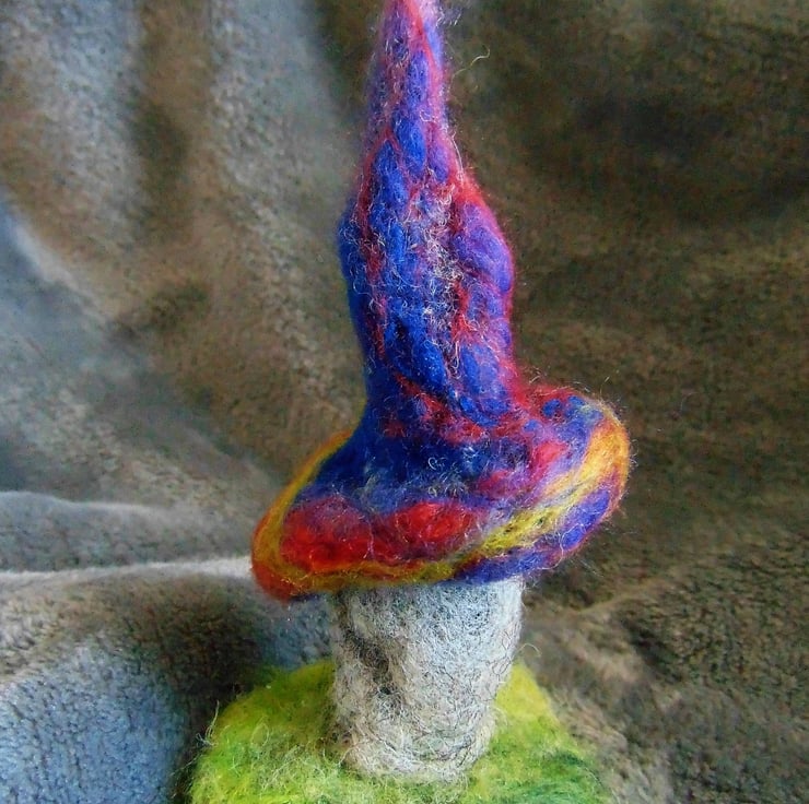 A fairy toadstool made using pure coloured and natural wool which has been sculpted into shape using a barbed felting needle.