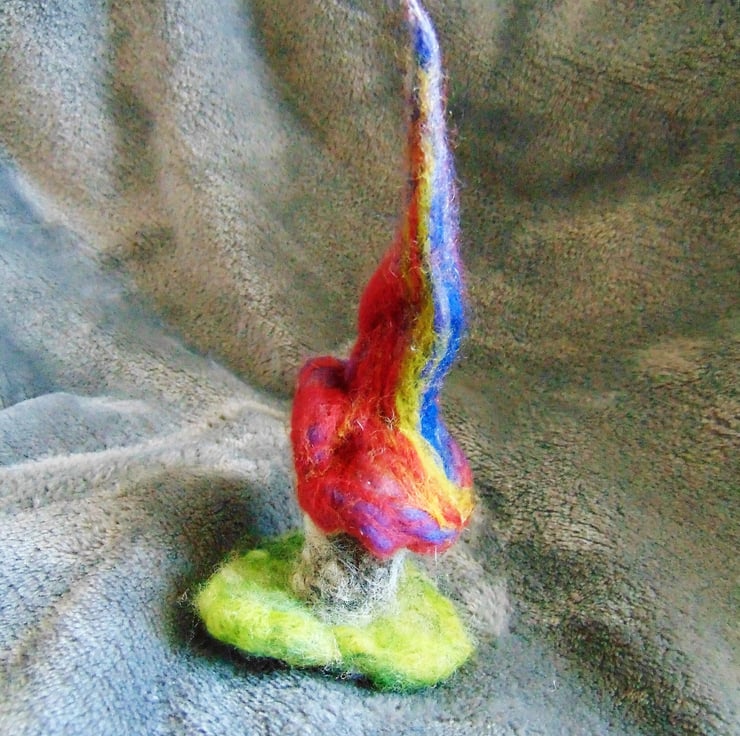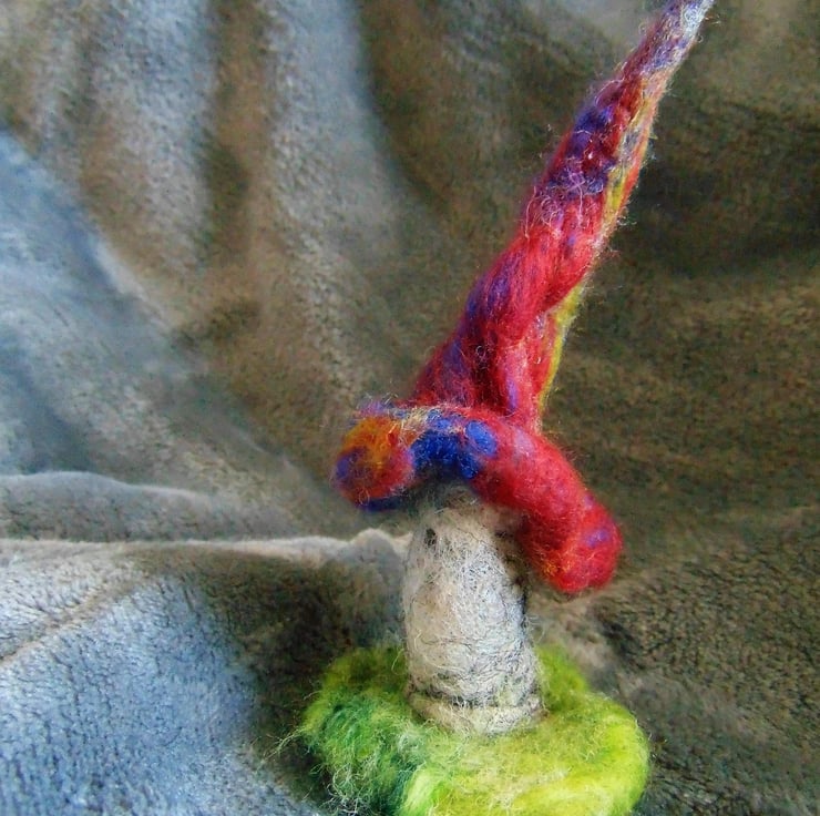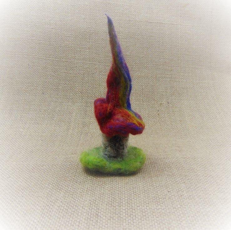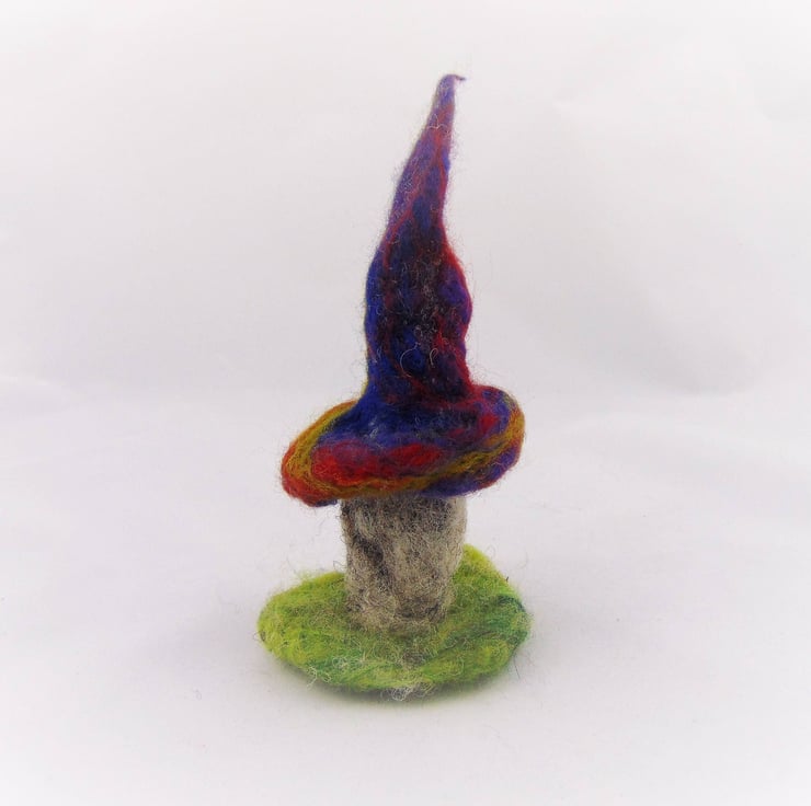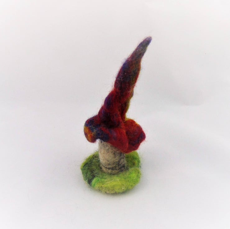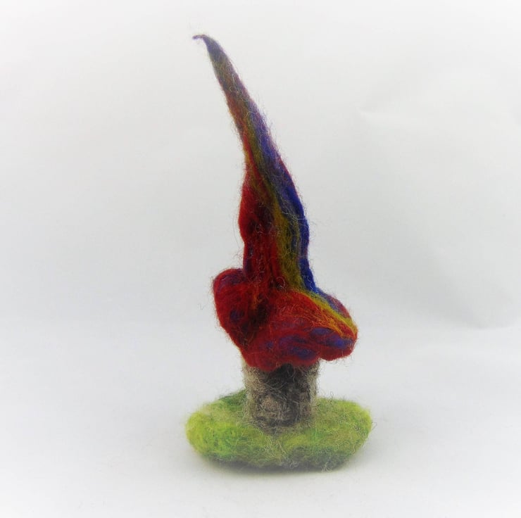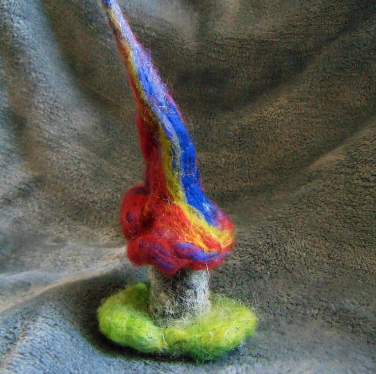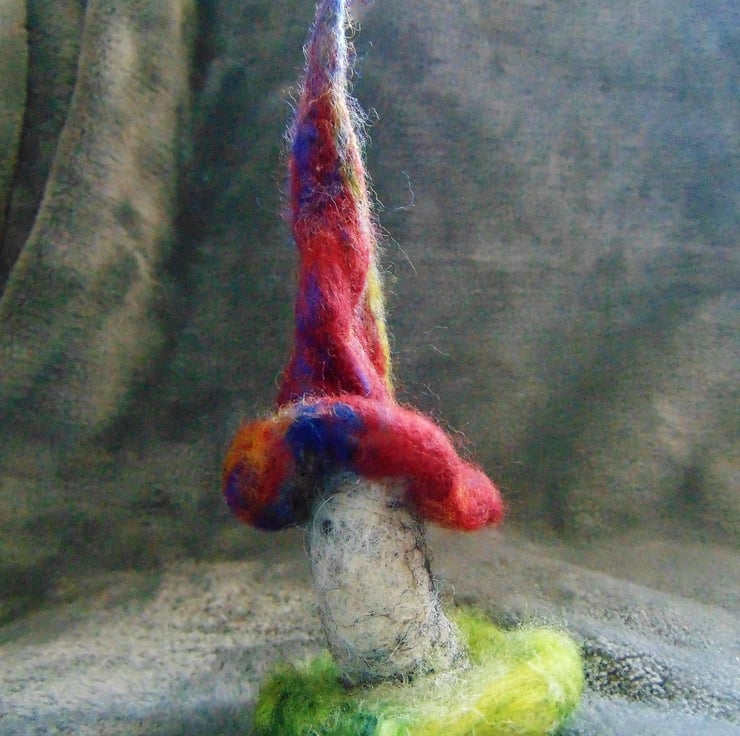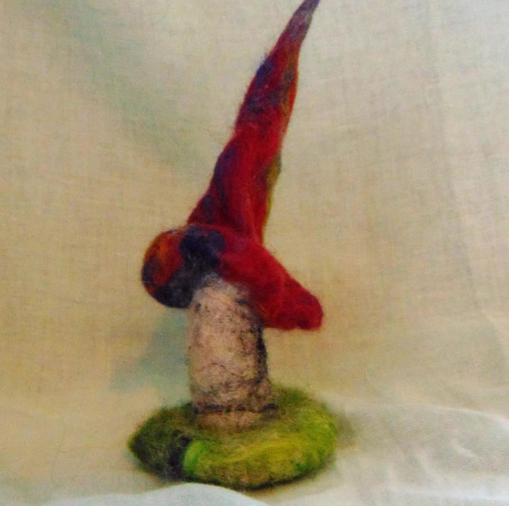 A fairy toadstool made using pure coloured and natural wool which has been sculpted into shape using a barbed felting needle.