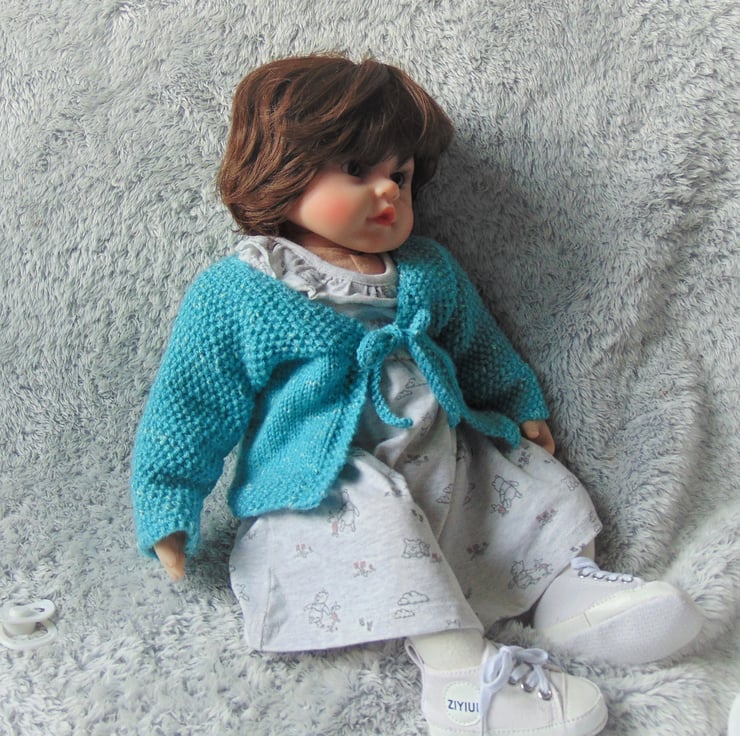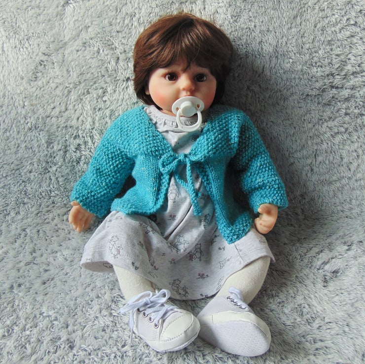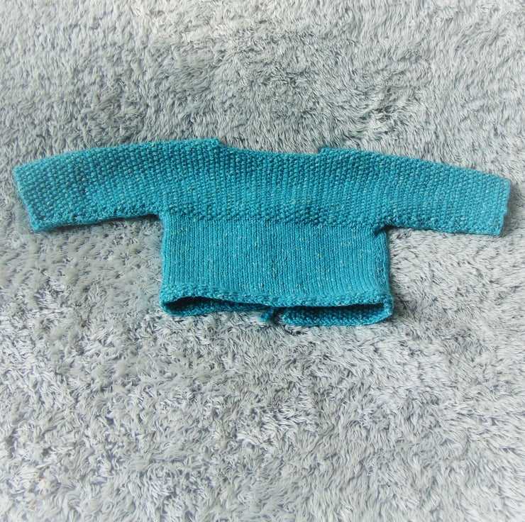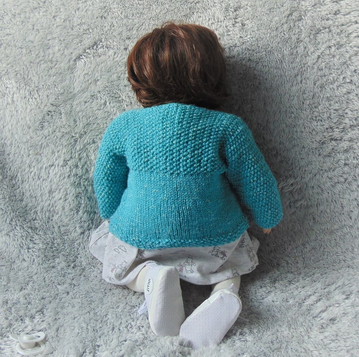 A lovely little baby cardigan in a soft teal colour with flecks of white in a moss stitch and stocking stitch pattern. This jacket is soft and cosy and would make a thoughtful gift for a new baby. It is made with a natural cotton and acrylic blend, which is light and cool to wear in warmer weather, and yet still warm when it gets colder.