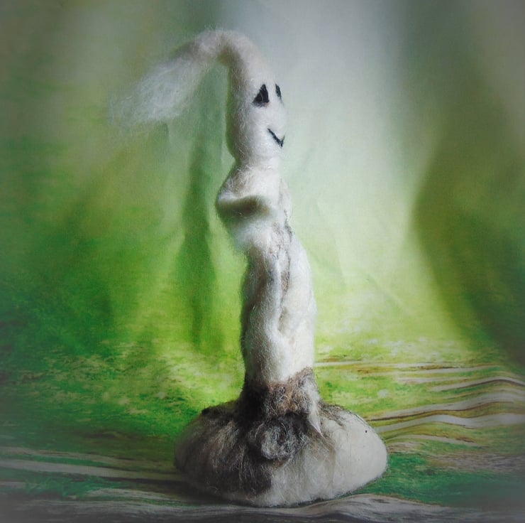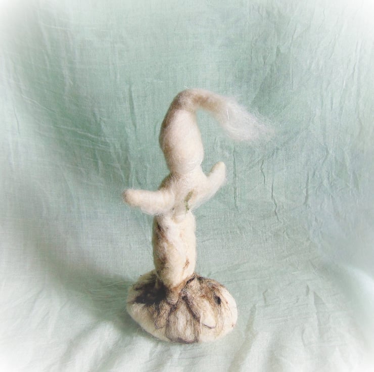 This cute figurine is created by wrapping wool around a wire armature and then securing and sculpting with a felting needle. He is attached to a little wooden plinth which I have then covered in natural sheep's wool and sculpted into place.