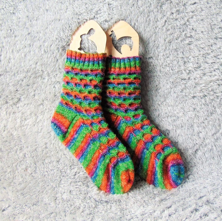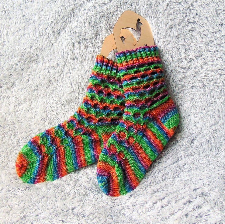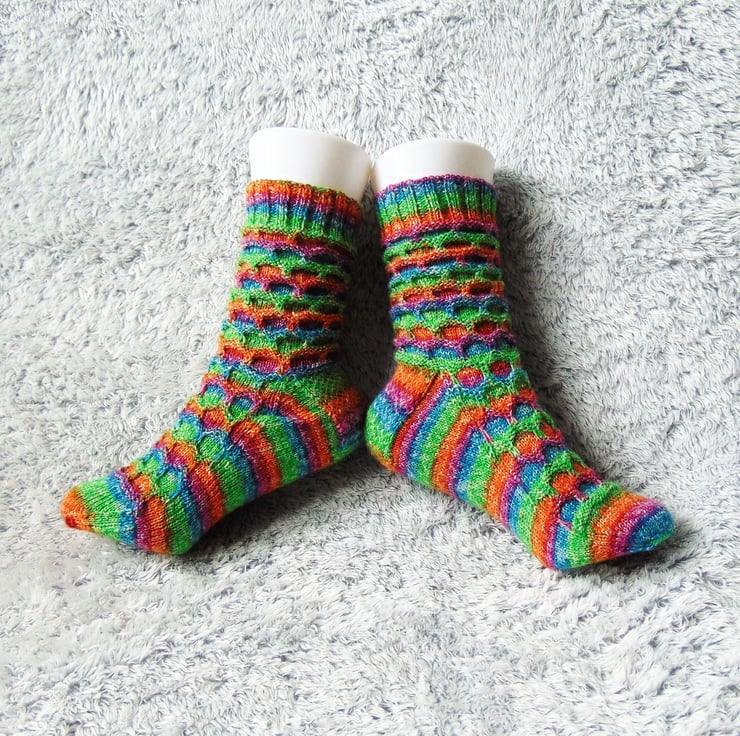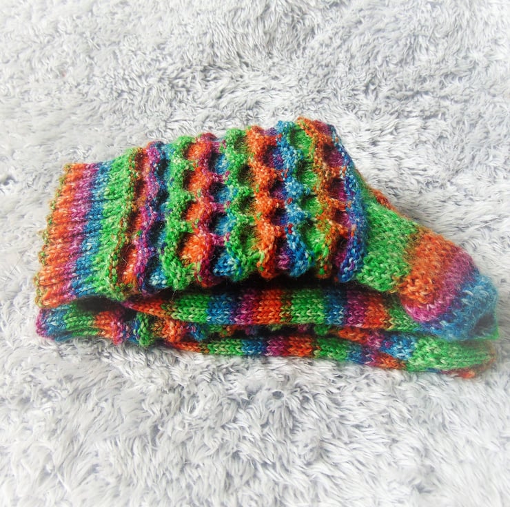 A pair of hand-knitted, brightly-coloured socks with a bubbly honeycomb stitch pattern. The lovely rainbow coloured yarn has bold stripes of colour which creates an interesting and unusual sock, especially when combined with the circle pattern. These socks are cosy and friendly and would make a thoughtful gift. They are made with a natural wool blend, which is cool to wear in warmer weather, and warm when it gets colder. Wool is soft, elastic, breathable and odour-resistant. It naturally wicks moisture away from your skin.