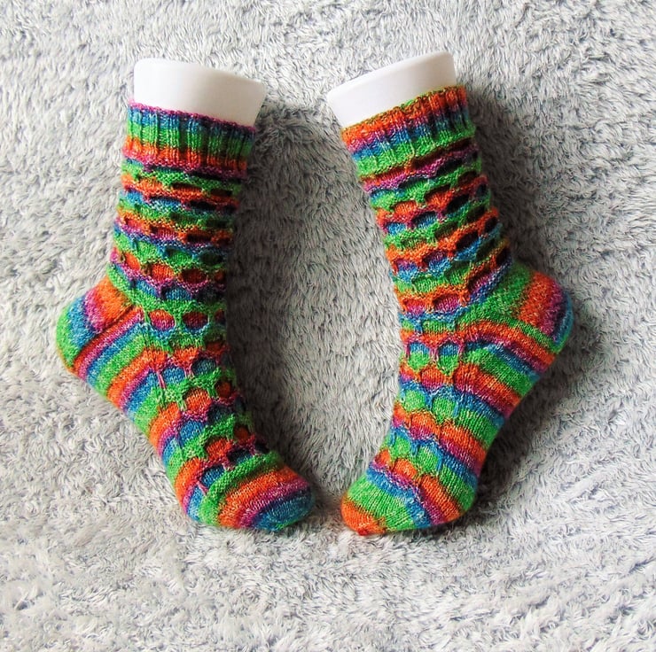I have taken a few photos to show the colours in the socks, but, as you know, monitors vary. I have also taken a close up of the stitch detail so that you can see the pattern.
