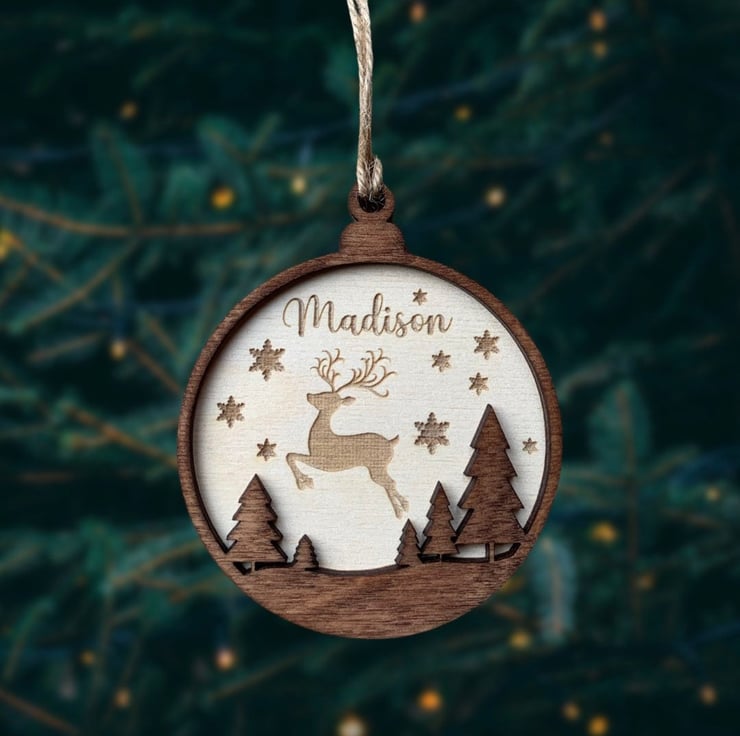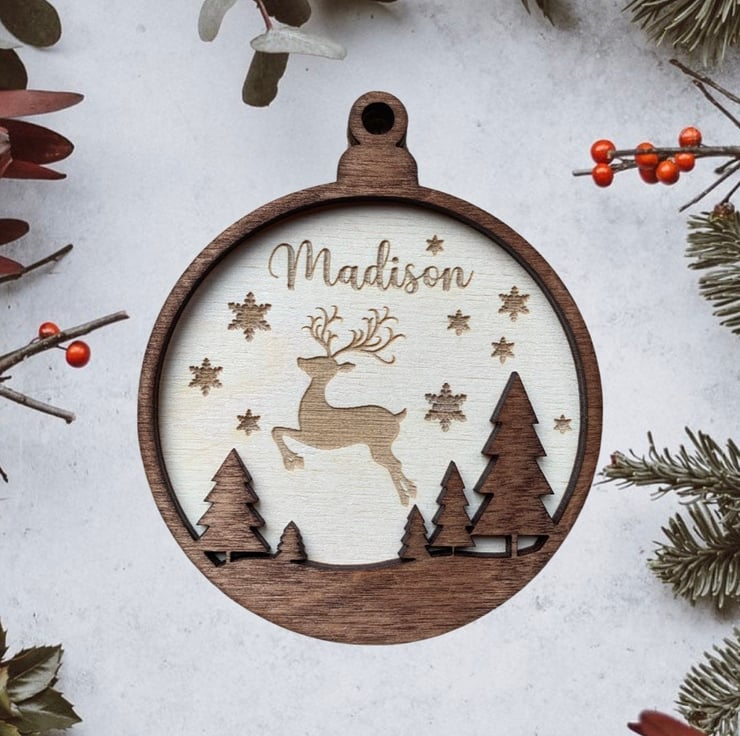 Beautiful personalised Wooden leaping reindeer Christmas tree decoration bauble.