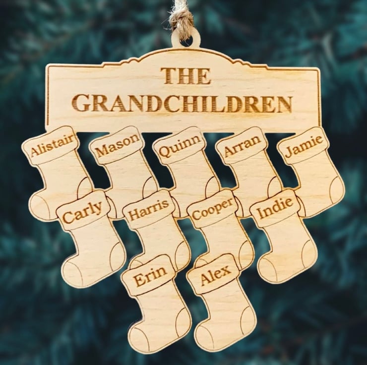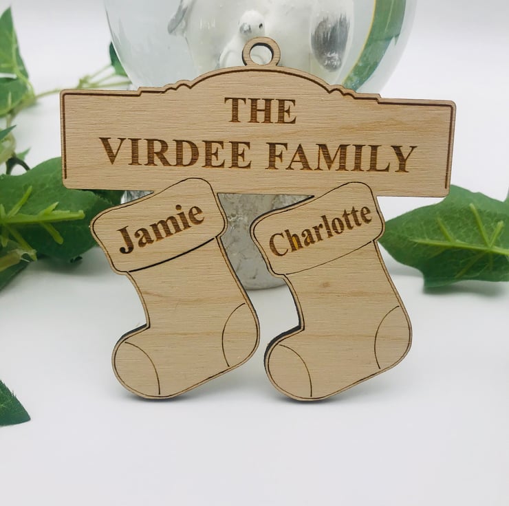 The Grandchildren can all be displayed on these family tree stocking ornaments. A fabulous gift for the grandparents. personalised family tree wooden Christmas tree bauble ornament.