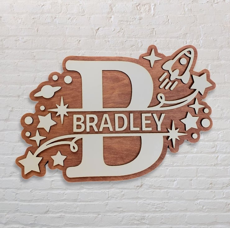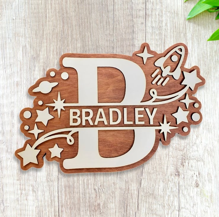 This lovely wooden space themed rocket name plaque is the perfect addition to a child s room. Measuring 30cm in width and around 25cm height depending on the letter. This wall plaque will fit on a shelf or attach it to the wall or door