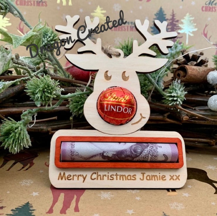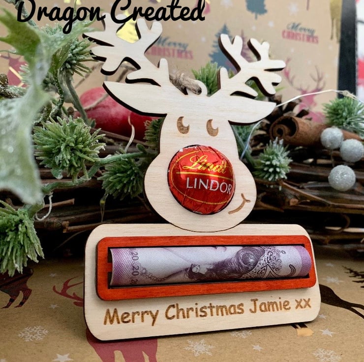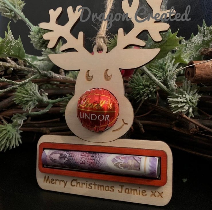 Fun Chocolate and money Reindeer bauble, tree decoration. simply add a Lindor chocolate for his nose, and roll a 5, 10 or 20 and slip it over the money holder.