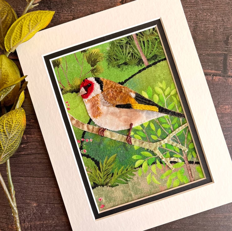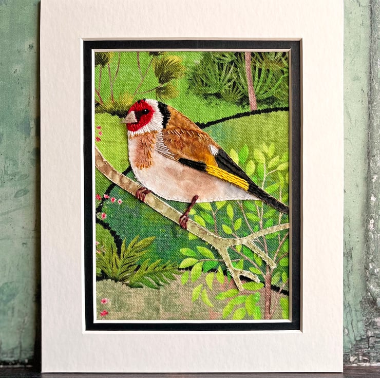 A hand sewn textile artwork of a goldfinch. A lovely original gift for a nature lover or someone who enjoys watching the birds in their garden.