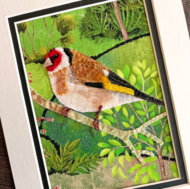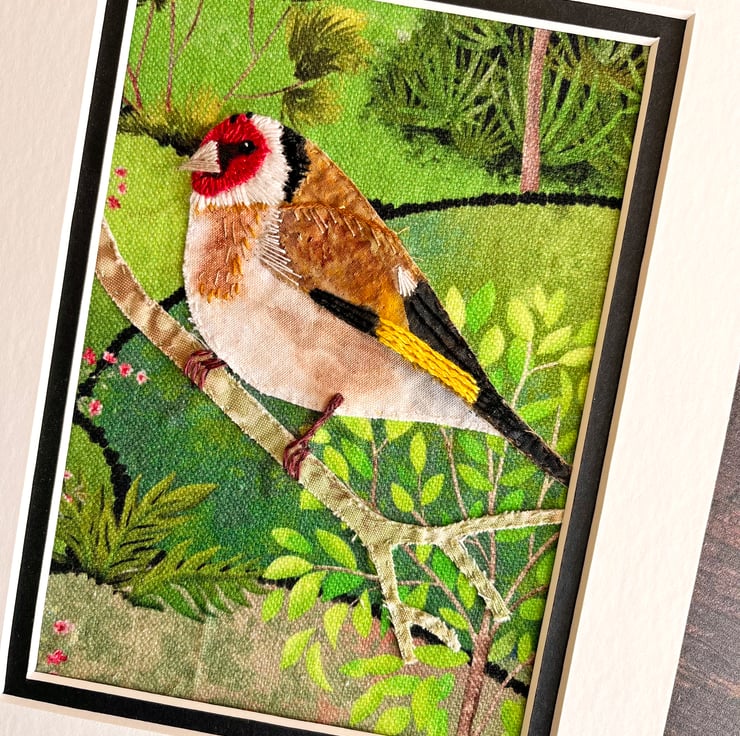 A section of upholstery fabric with a countryside scene has been used as the backdrop and I've added the branch and goldfinch using layers of fabrics and added texture and colour with acrylic paints, ink and embroidery threads.