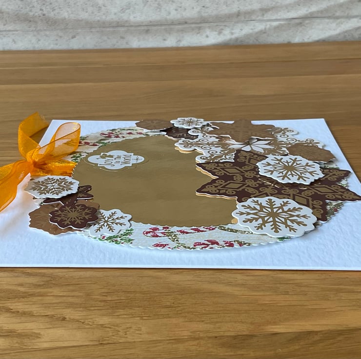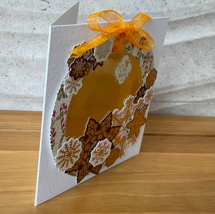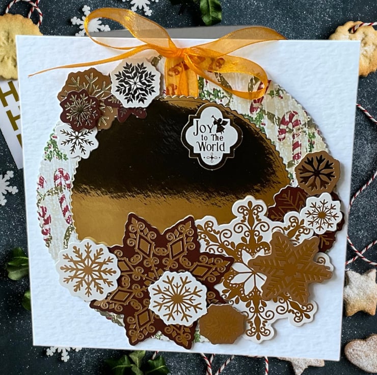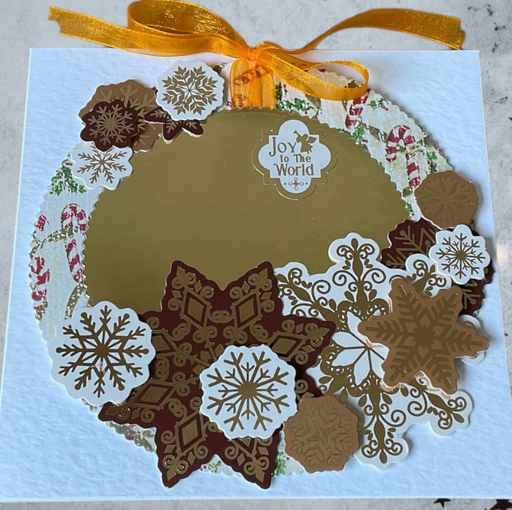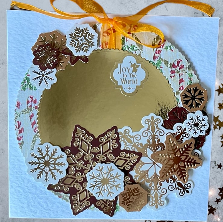 Perfect for wishing someone a Happy Christmas this festive card features a die cut wreath decorated with layers of snowflakes in shades of creams and browns with an orange bow. The card has a vintage style wreath featuring candy canes around a gold centre. Die cut snowflakes have been added in 3 D. The sentiment Joy to the World has been added.