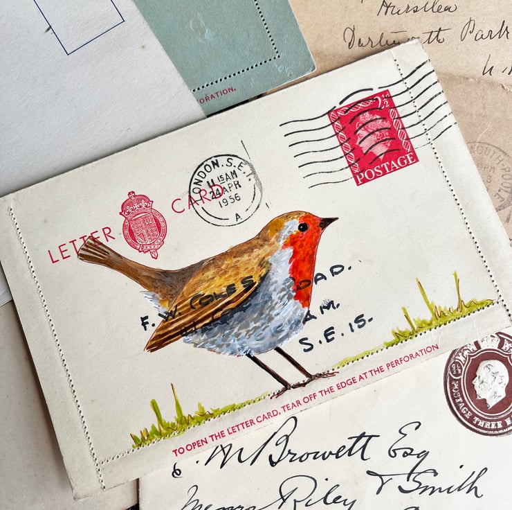 This pretty robin has been painted onto a used vintage letter card using inks and acrylic paints.