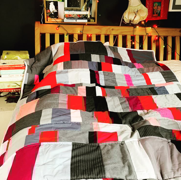 I can also make a quilt from your beloved clothes or fabrics. Memory quilts are subject to a 10% surcharge as harvesting fabric from clothes is a painstaking and lengthy process!