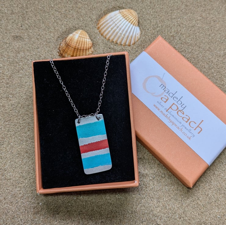 This lightweight anodised aluminium necklace is hand dyed, turquoise and red with a plain aluminium back.