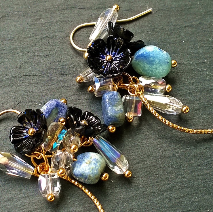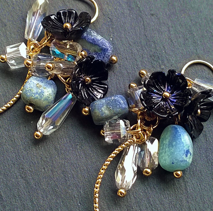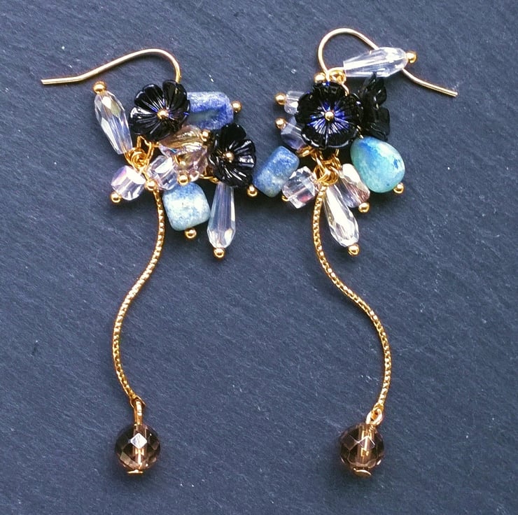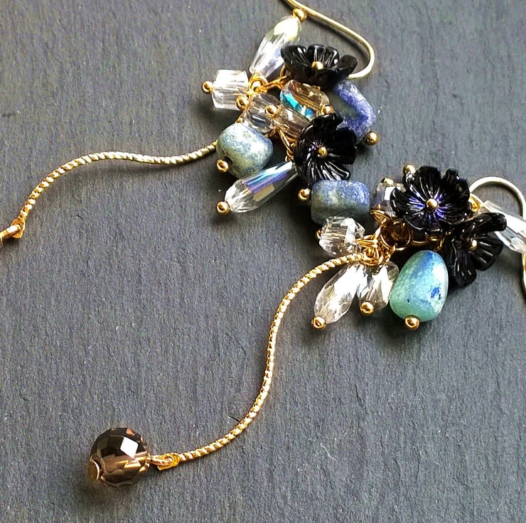The cluster is made up of lucite dark blue flowers, faceted glass and blue agate nuggets with gold plated elements. The long diamond-cut spiral is finished with a sparkly faceted smoky quartz 6 mm bead.