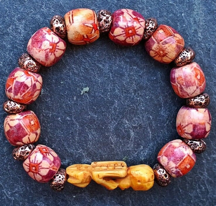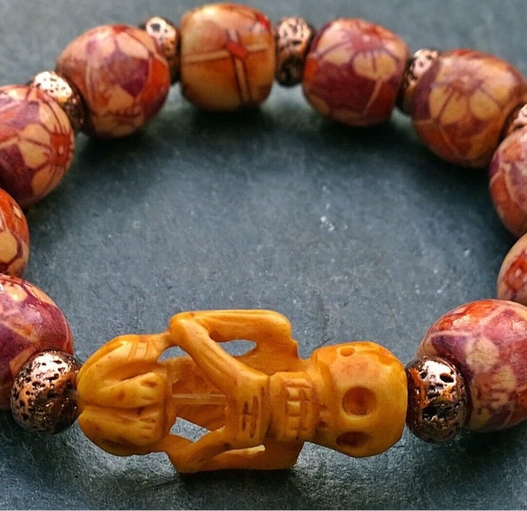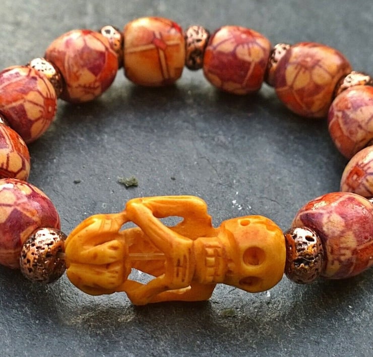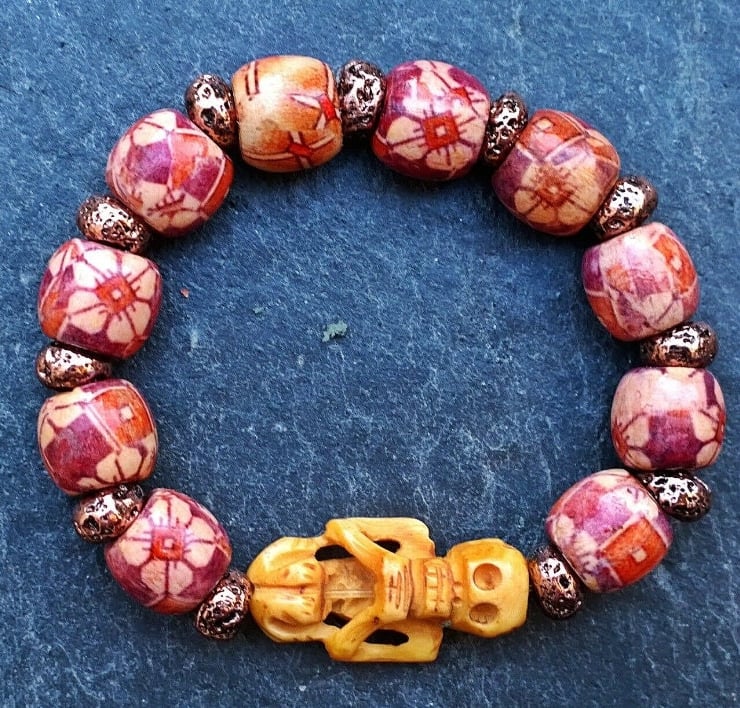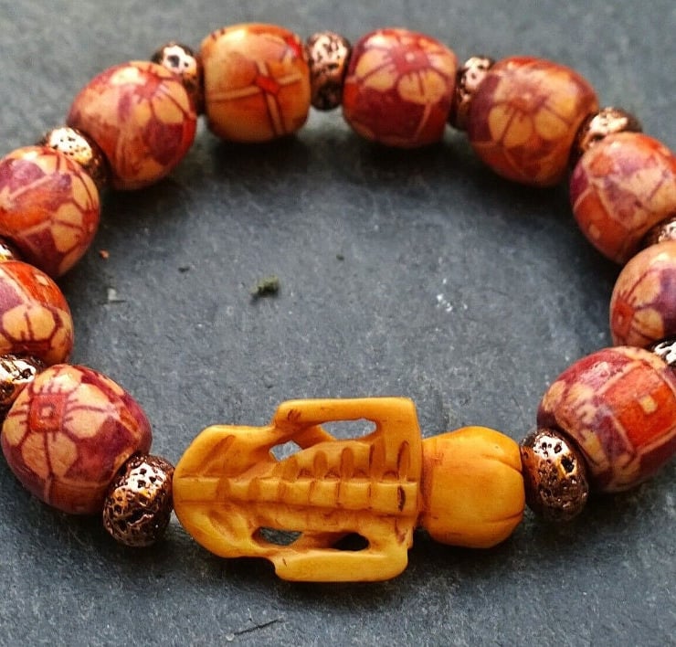 This bracelet features a hand carved skeleton made from ox bone, floral design wooden beads and copper plated lava stone.