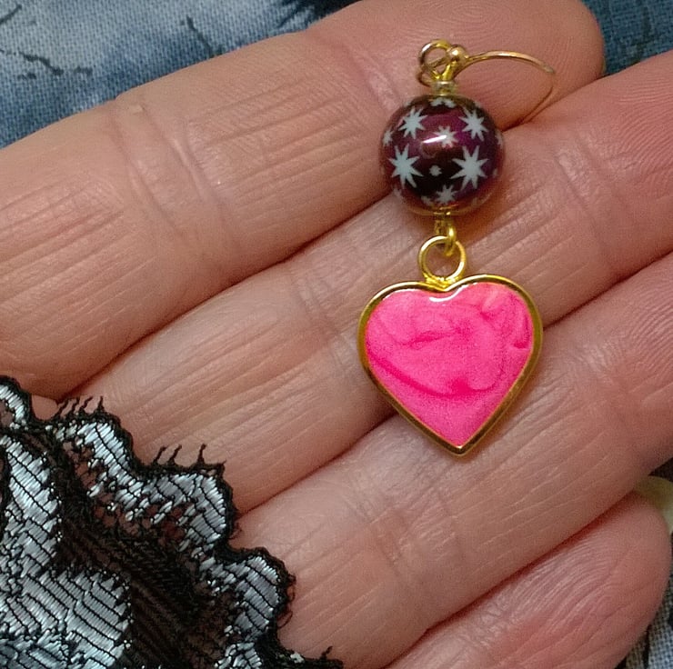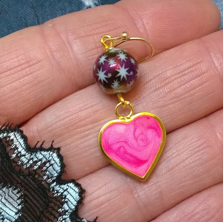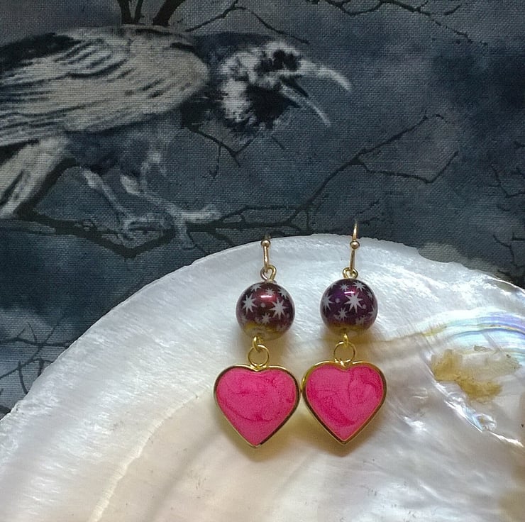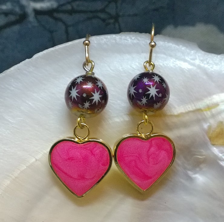 A pair of colourful earrings featuring a hot pink enamelled swirl heart dangling from a purple starry skies bead.