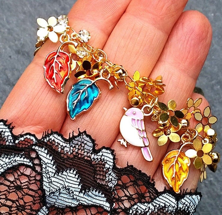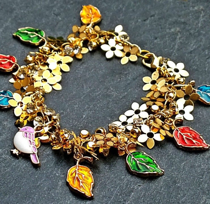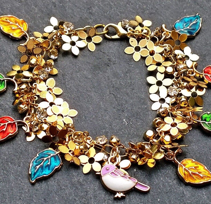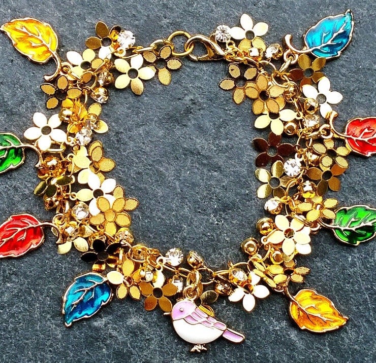 An eye catching bracelet with gold flower charms and crystal dangles. A little purple and white enamelled bird sits among the gold flowers and enamelled multi coloured leaf charms.
